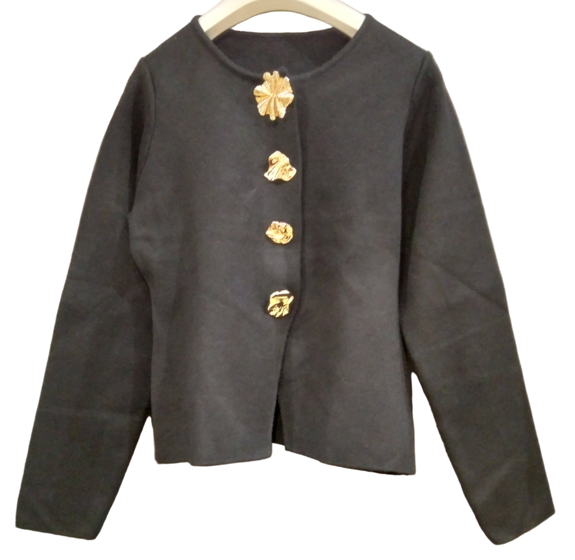 Questa giacca in maglia con bottoni oro è perfetta per completare il tuo look in modo elegante e raffinato. Realizzata con materiali di alta qualità, ti offrirà comfort e stile durante le giornate più fresche. Il suo design versatile ti permette di indossarla sia per un'occasione formale che informale.