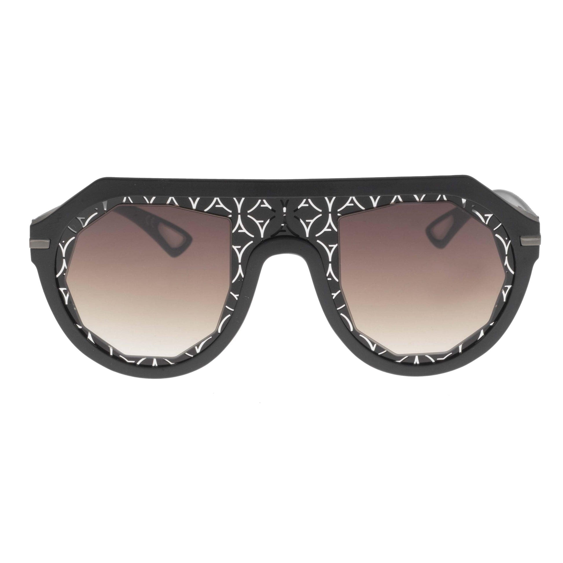 Questo modello oversize presenta frontale e aste nere, con dettagli geometrici e logo nero che ne sottolineano il carattere distintivo. La forma a maschera oversize valorizza il viso e conferisce un look moderno e iconico, perfetto per chi ama distinguersi.