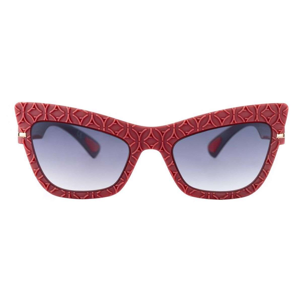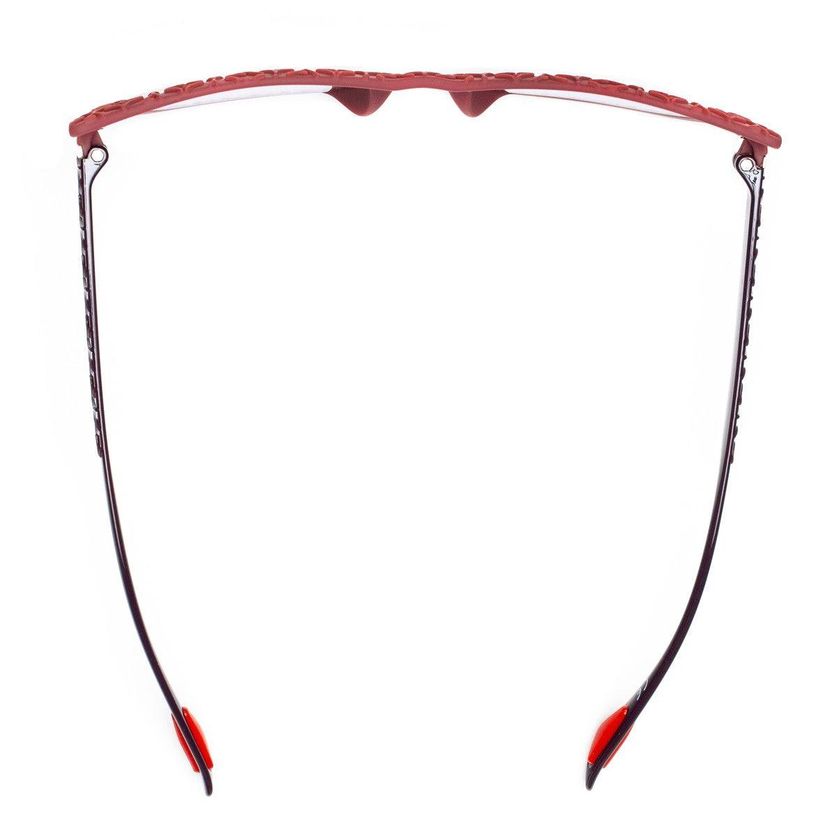 La sofisticata forma a gatto valorizza lo sguardo con eleganza, mentre il frontale bordeaux si abbina armoniosamente alle aste, creando un contrasto raffinato. La texture geometrica genera eleganti giochi di luci e ombre che donano profondità e carattere all’occhiale.
