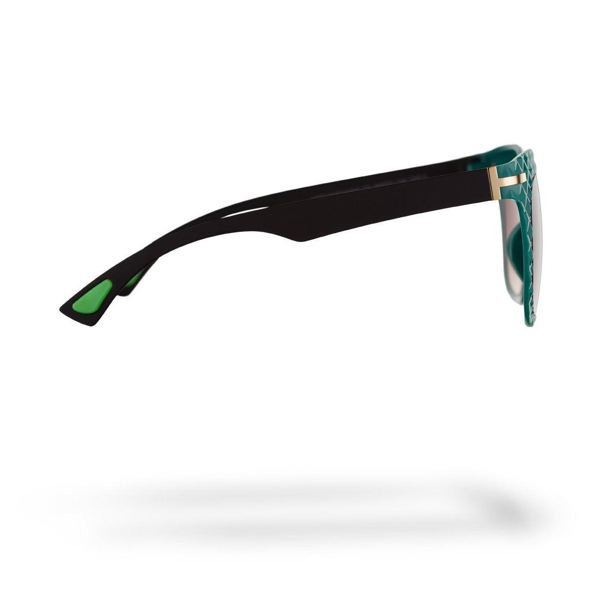 La montatura verde si abbina alle aste nere, creando un contrasto originale e moderno. Le lenti da sole marrone sfumato offrono protezione dai raggi solari e comfort visivo in ogni condizione di luce.