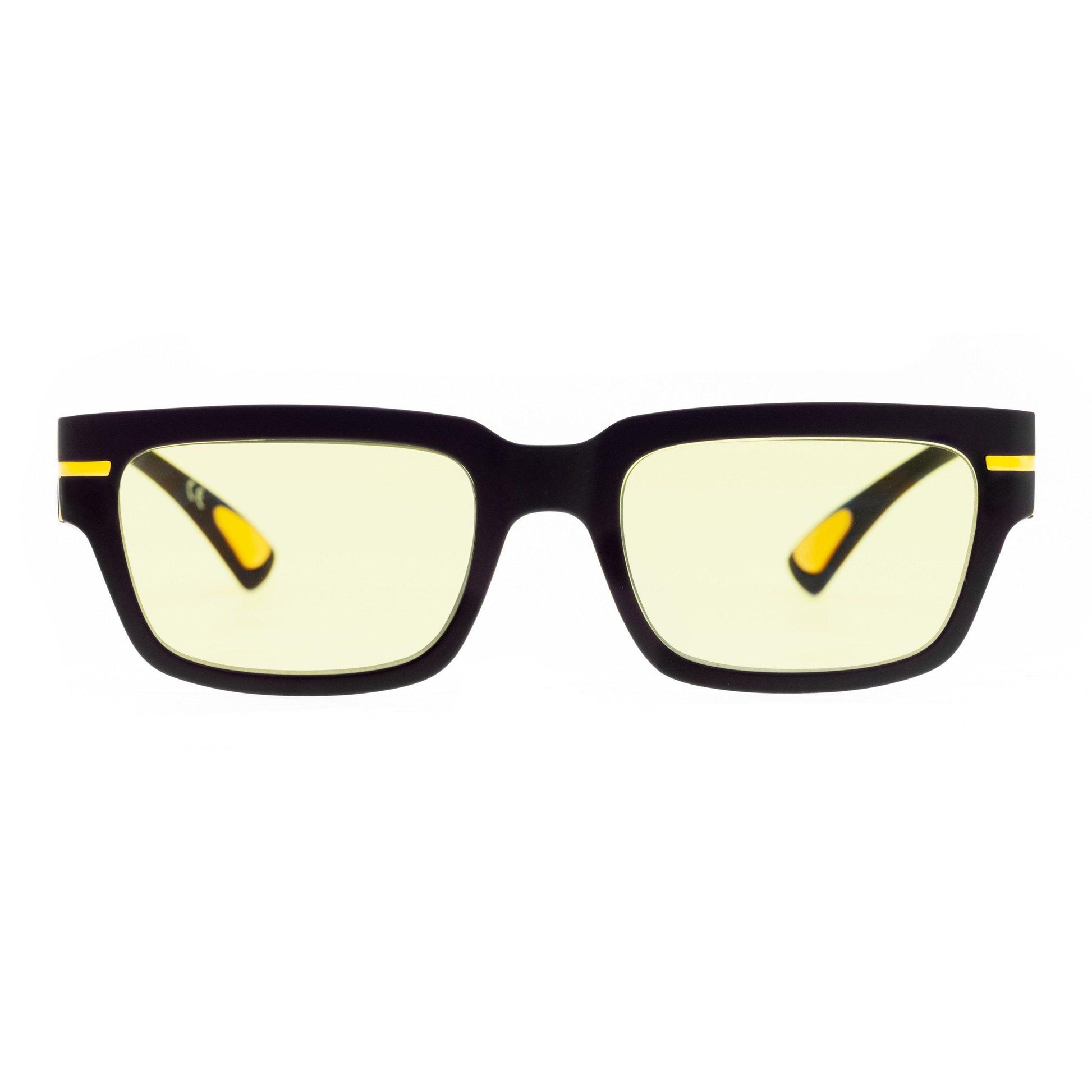 Il frontale e le aste nere sono valorizzati da dettagli gialli a contrasto, creando un look moderno e distintivo. Le lenti Blue Block giallo-grigie fotocromatiche si adattano alla luce e offrono protezione dagli schermi digitali, garantendo comfort visivo in ogni condizione.