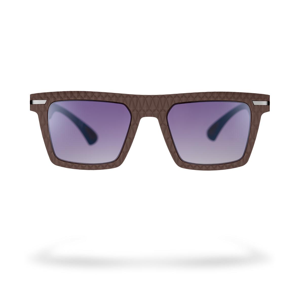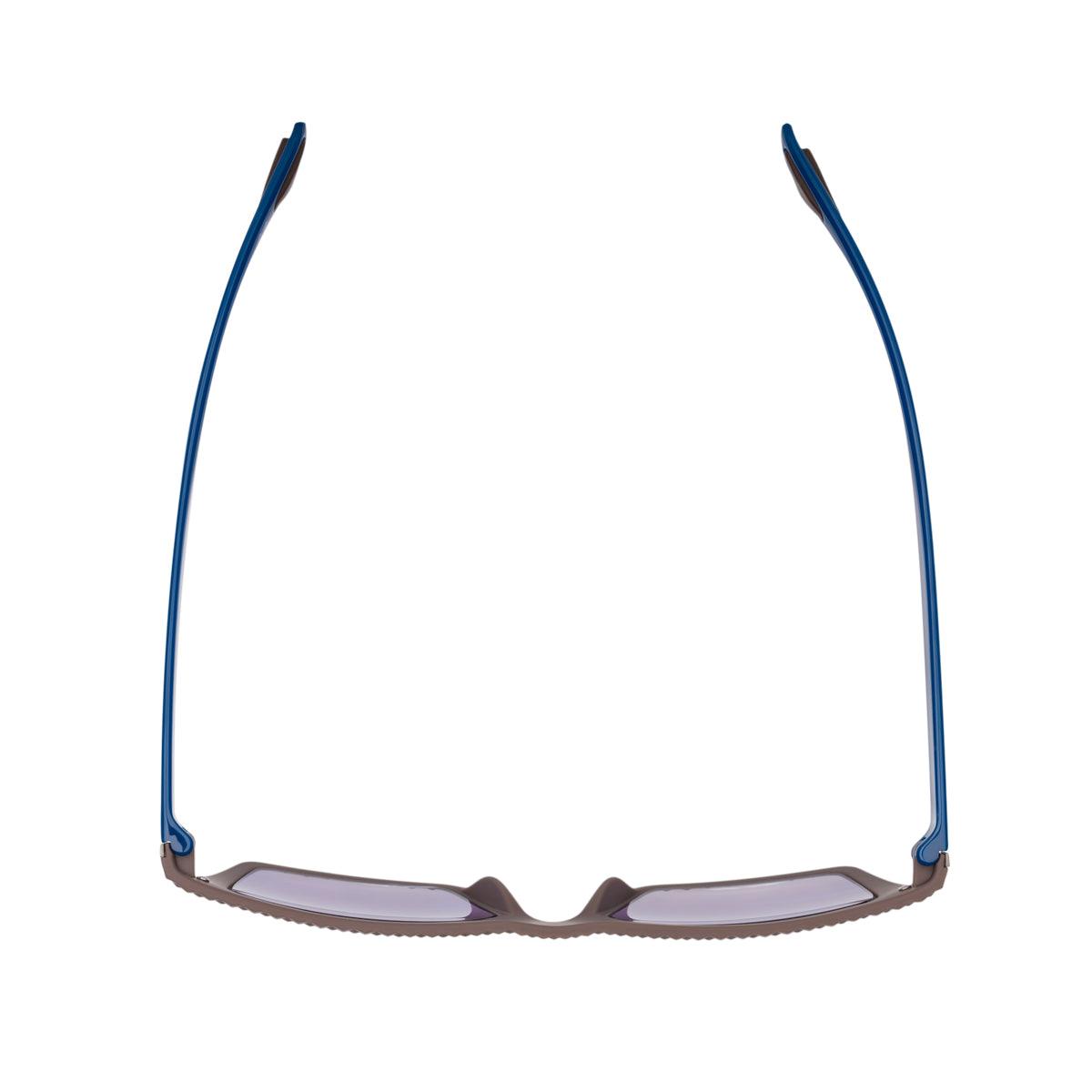 Il frontale marrone soft touch, morbido al tatto e dall’estetica raffinata, si abbina alle aste blu lucido per un contrasto elegante e sportivo. Le lenti viola sfumate garantiscono protezione solare e donano un tocco di originalità a un modello già iconico.