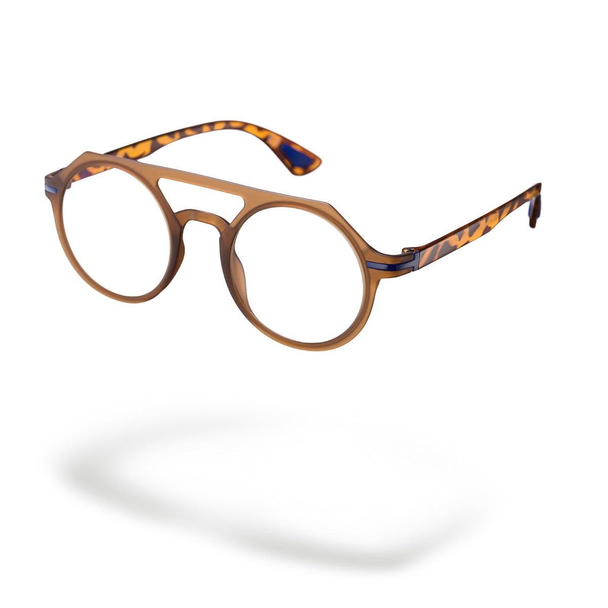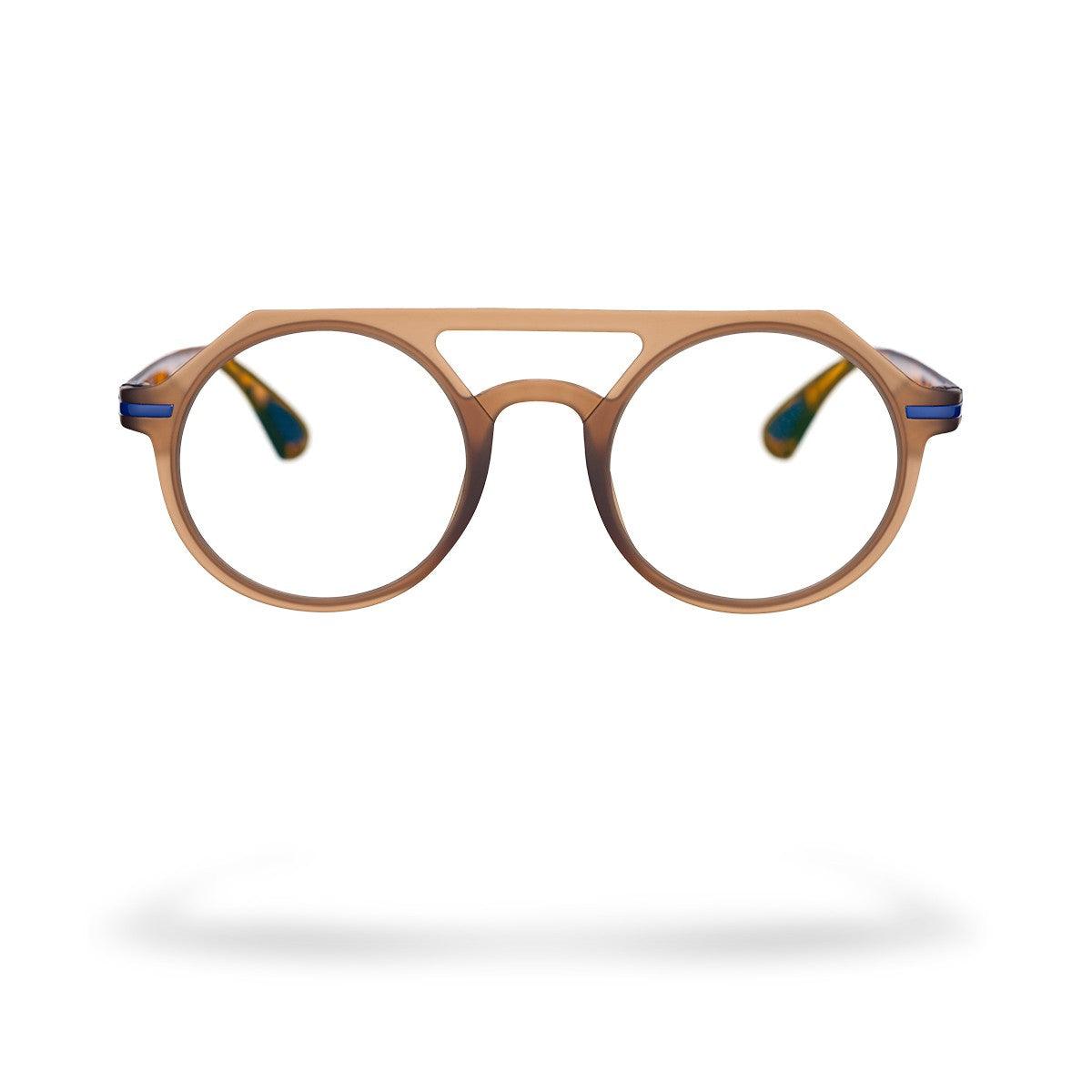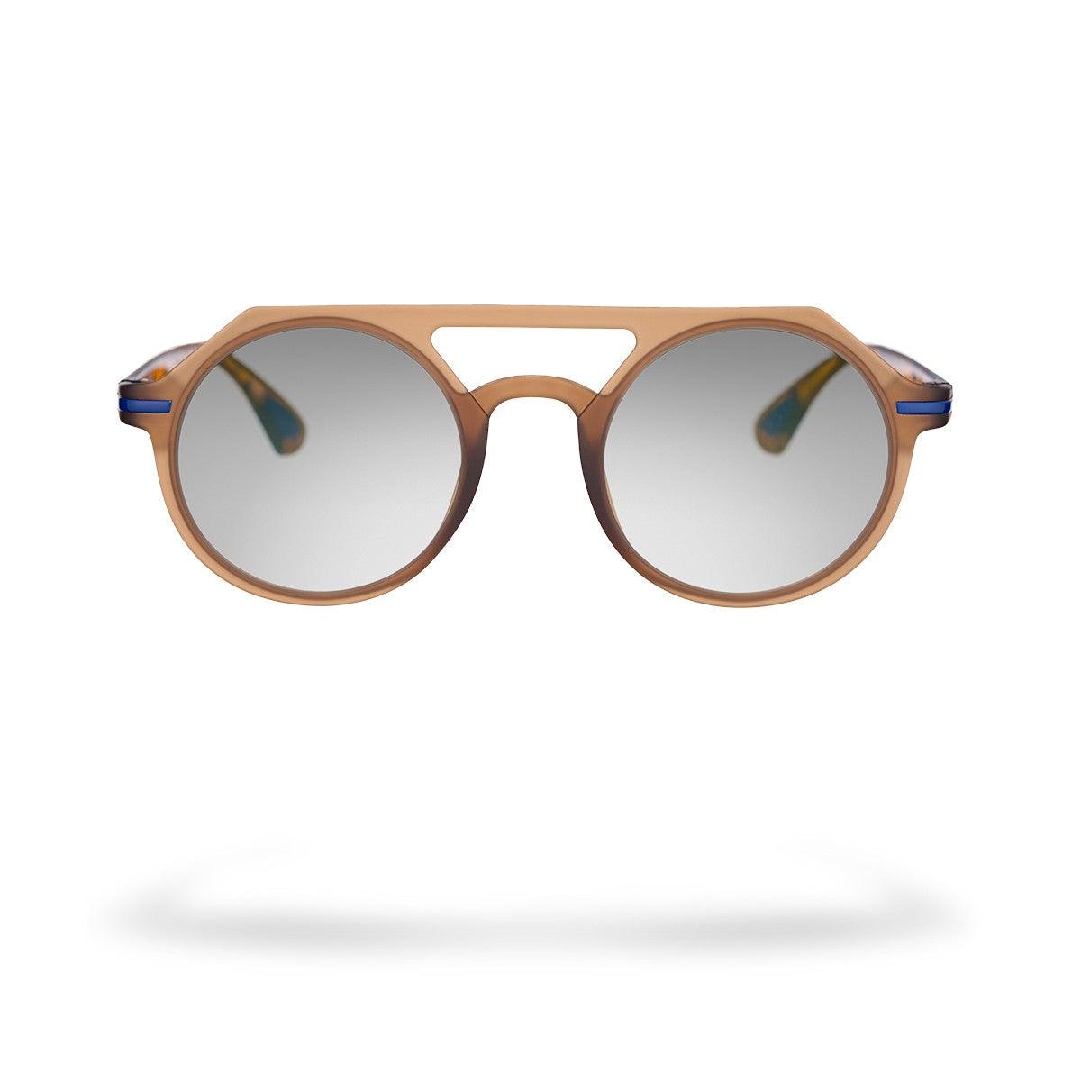 Il frontale marrone si abbina armoniosamente alle aste in avana lucido, creando un equilibrio tra calore e lucentezza. Le lenti grigie fotocromatiche si adattano automaticamente alla luce, offrendo comfort visivo e protezione UV in ogni condizione.