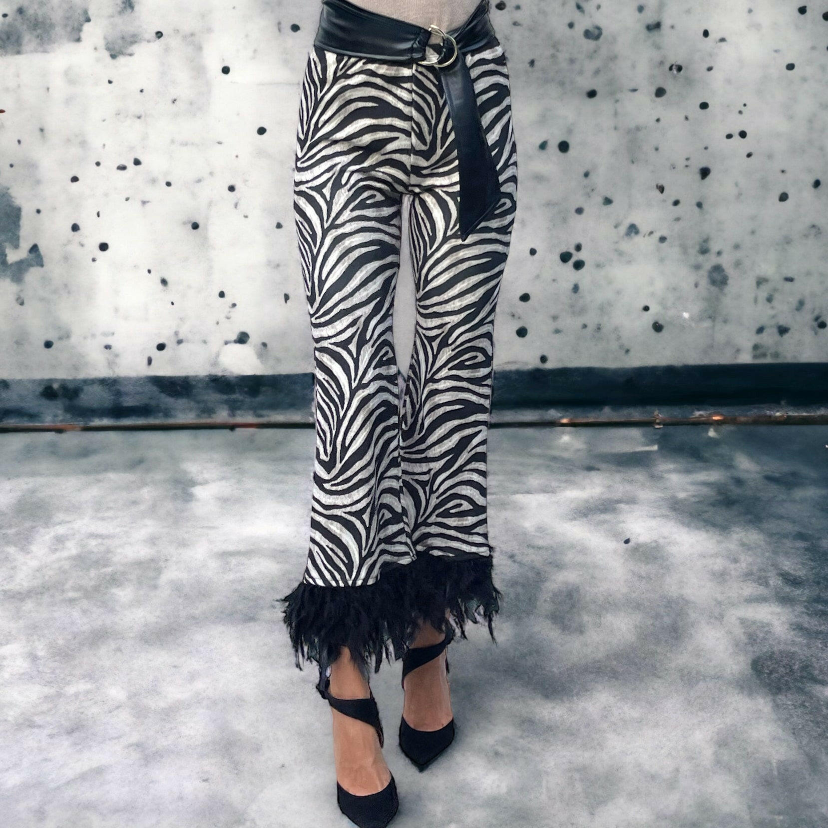 Pantaloni alla caviglia in crépe stretch in un disegno esclusivo animalier orlati da un bordo di piume.