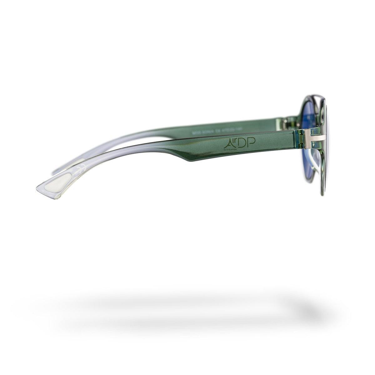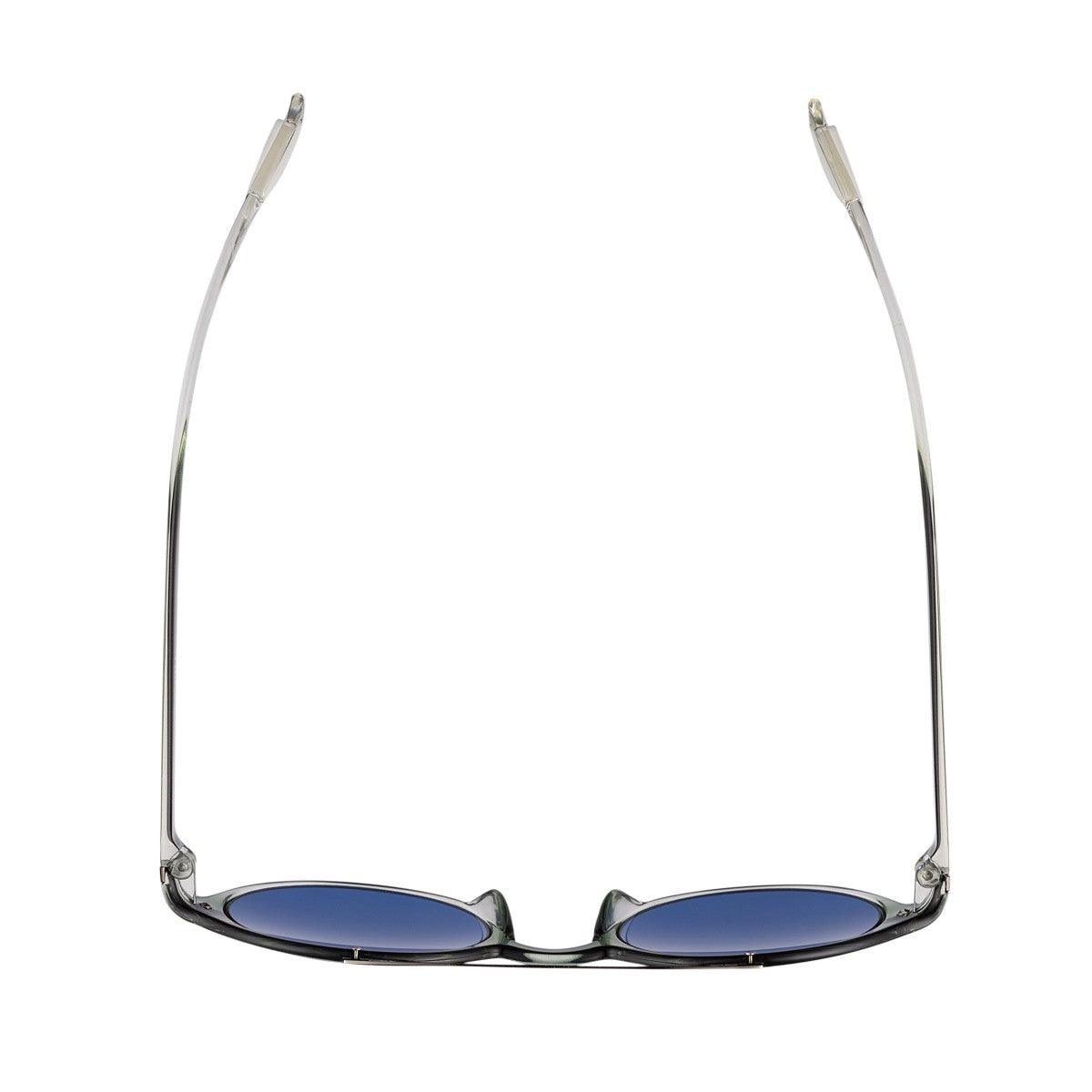 Il frontale rotondo in verde lucido crystal sfumato si distingue per la sua leggerezza visiva e per un gioco cromatico raffinato, che si ritrova anche nelle aste sfumate verde lucido crystal. Il tlogo grigio si inserisce con stile in questo mix sofisticato.