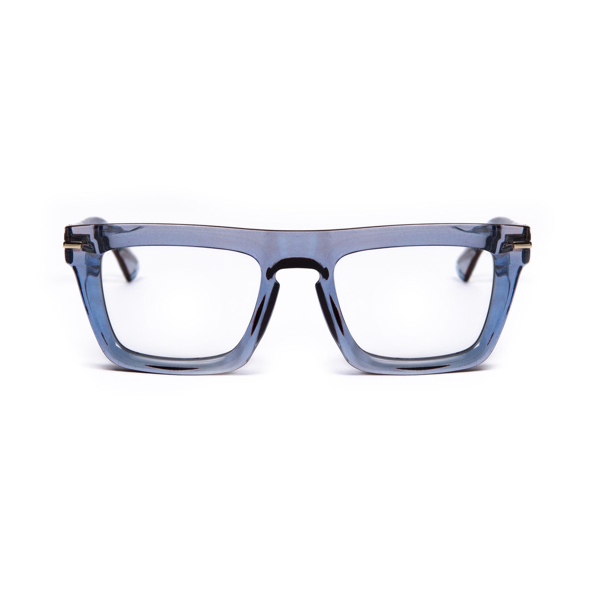 Il frontale e le aste azzurro trasparente, combinati con il top marrone, creano un contrasto delicato ma distintivo, perfetto per chi cerca un look elegante e di carattere. L'uso di trasparenze e finiture raffinate conferisce al modello un aspetto leggero e versatile, adatto a qualsiasi occasione.