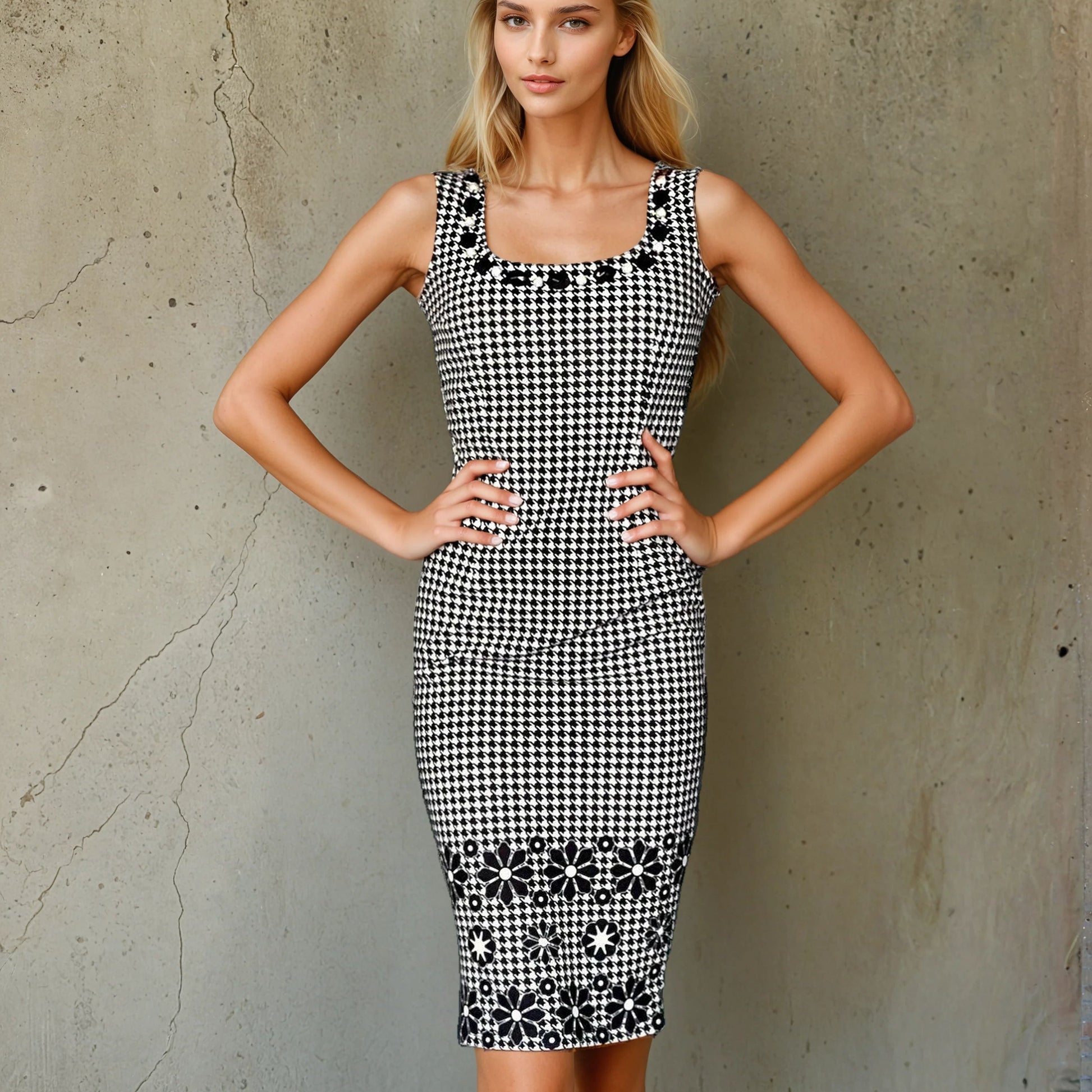 Abito a tubino Pied-de-poule con bordo floreale e ricamo di pietre nello scollo.
