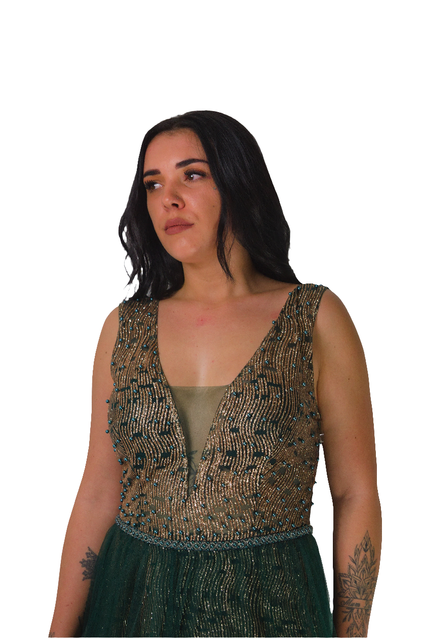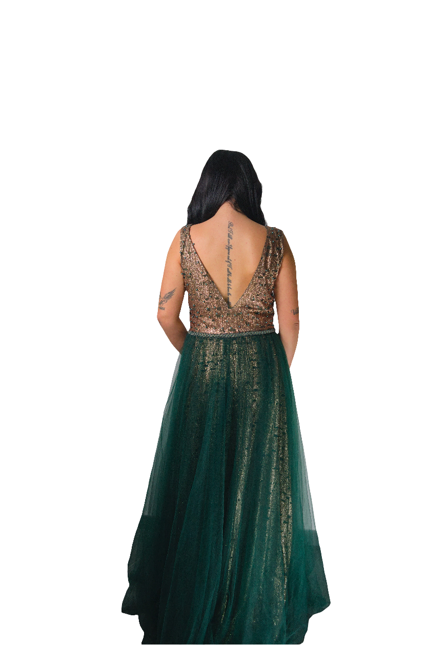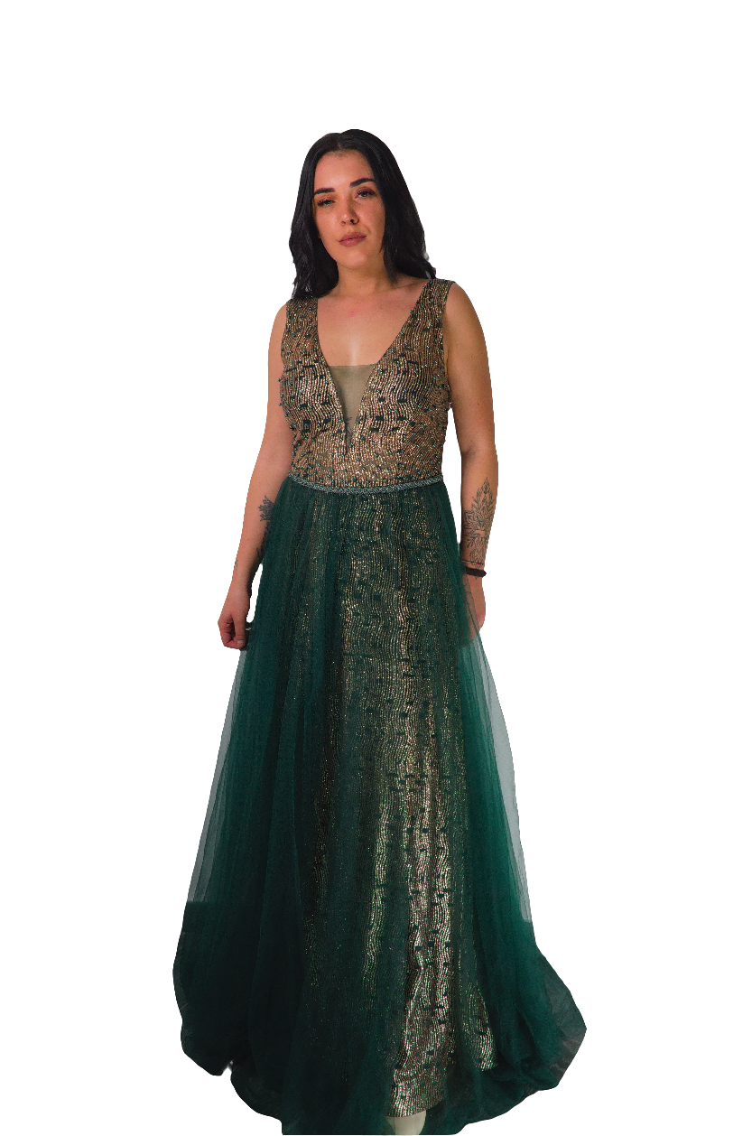 Esalta la tua bellezza con l'Abito Princess a sirena con paillettes dorate e velo verde bottiglia. La perfetta combinazione di eleganza e stile per una serata indimenticabile. Scegli un abito che ti farà sentire come una vera principessa.