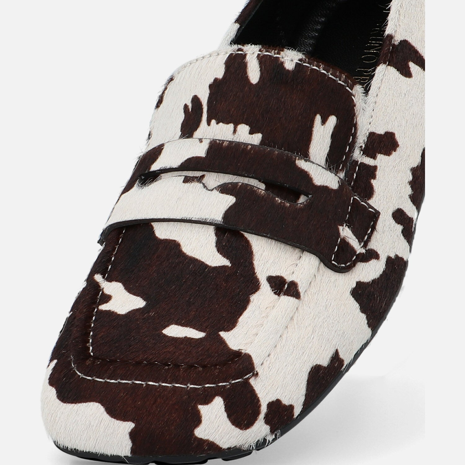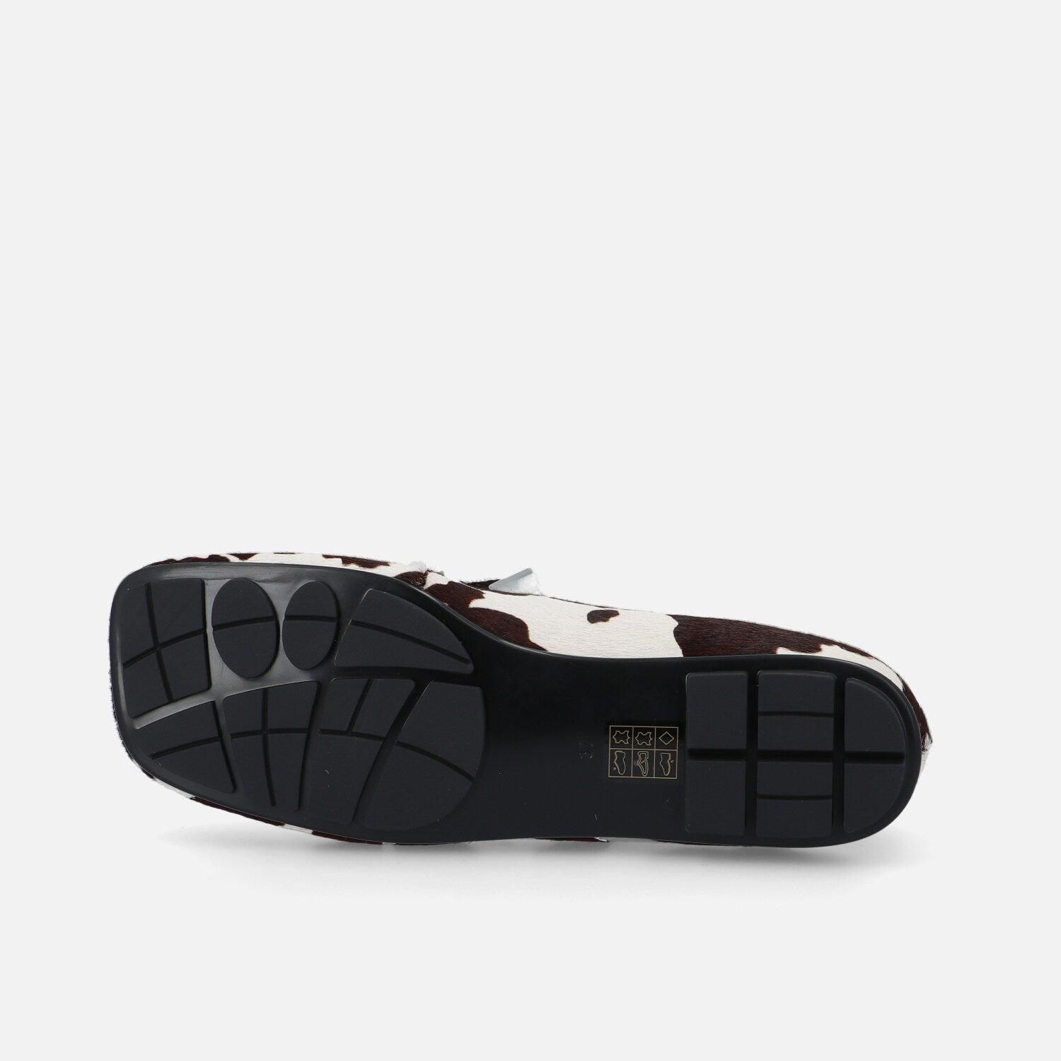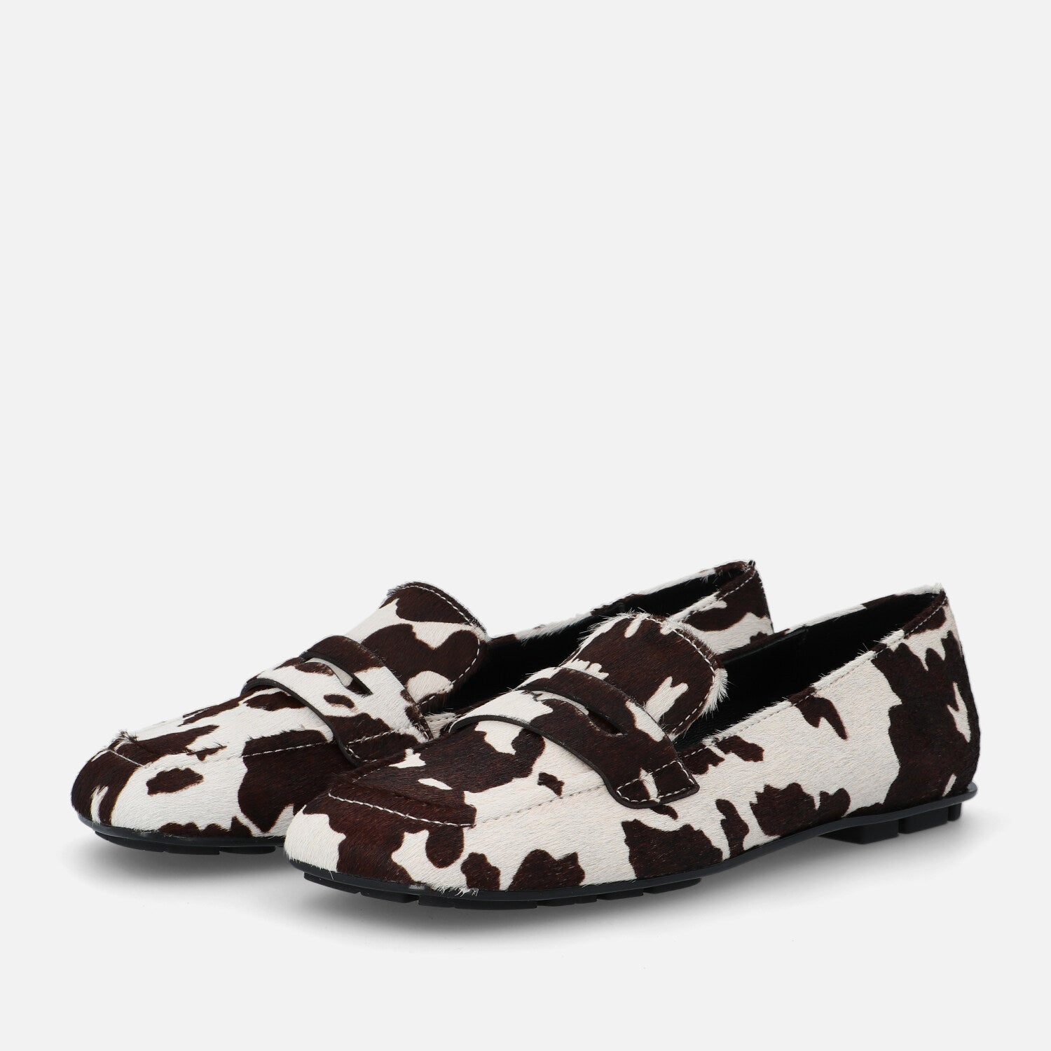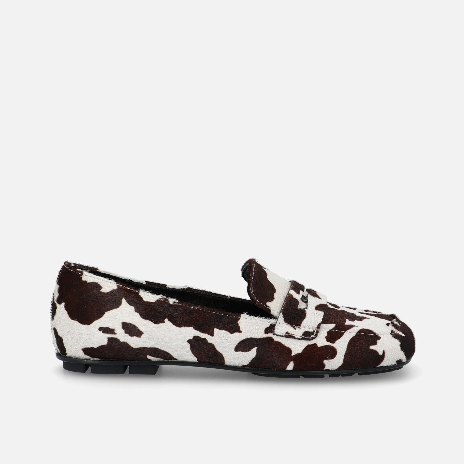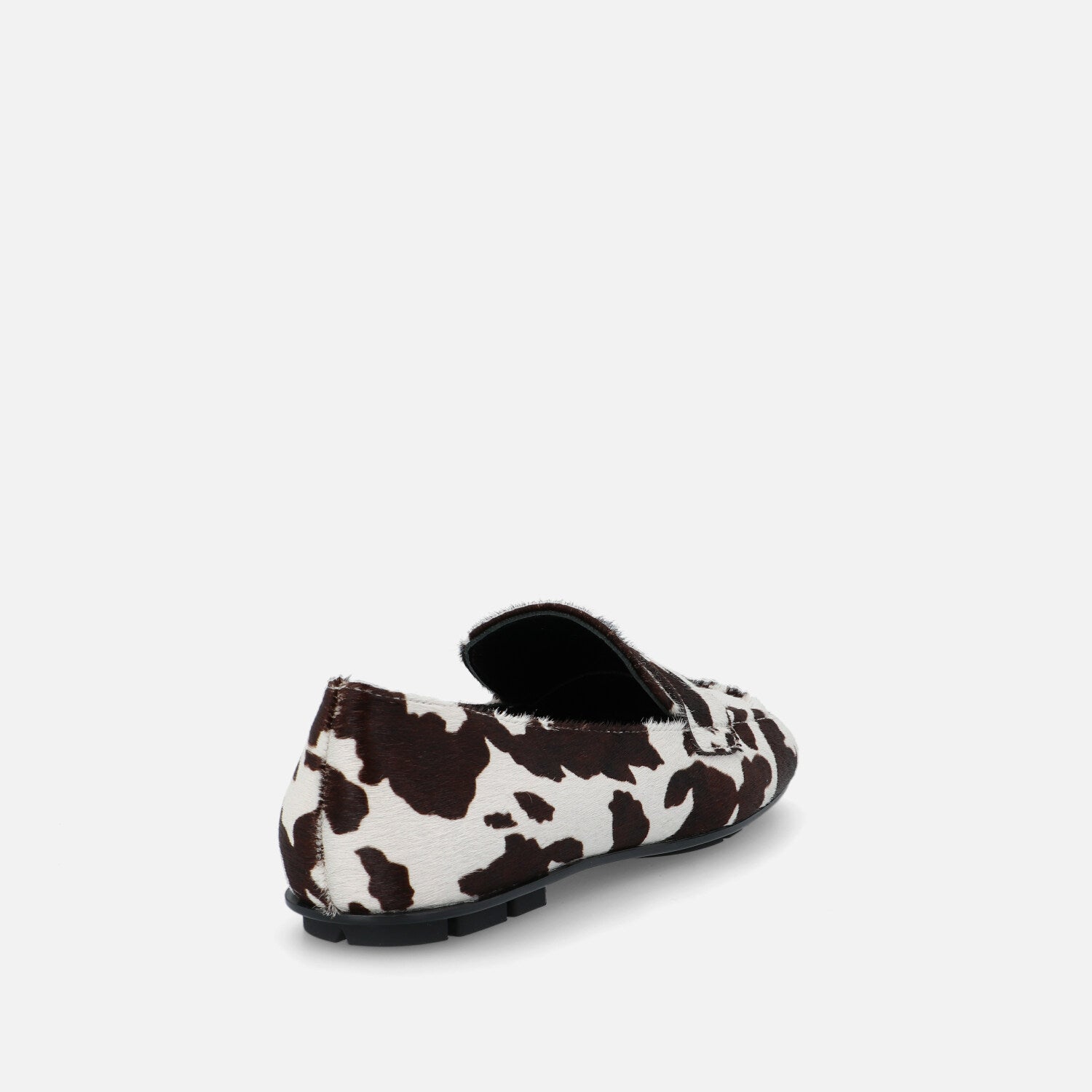 Il mocassino Baer Lof è realizzato in cavallino con stampa mucca e reinterpreta in maniera contemporanea il classico modello maschile del penny loafer. La tomaia in pelliccia effetto pony è decorata da una vivace stampa animalier black & white, che dona personalità e carattere deciso al design. La costruzione presenta una linea squadrata, con la tradizionale mascherina frontale tono su tono e una suola ultraflat in gomma con tasselli che assicura grip e comfort nella camminata. Un modello perfetto per chi vuole distinguersi con uno stile audace e giocoso, senza rinunciare alla comodità e all’eleganza casual.