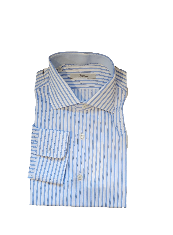 La camicia uomo Ingram è realizzata in un elegante tessuto a righe azzurre con dettagli in tessuto lavorato Oxford su collo e polsi. Offre un'immagine professionale e sofisticata, perfetta per ogni occasione.