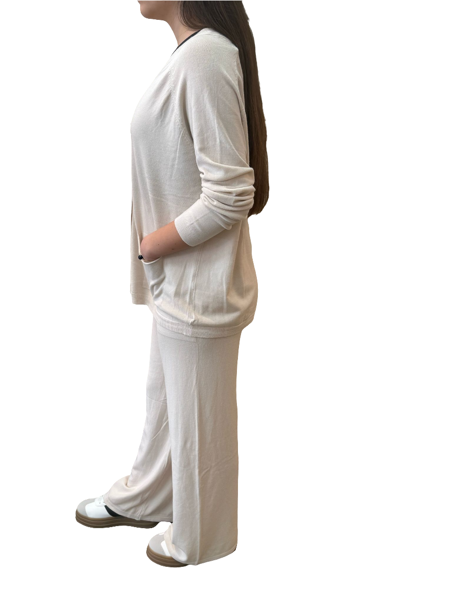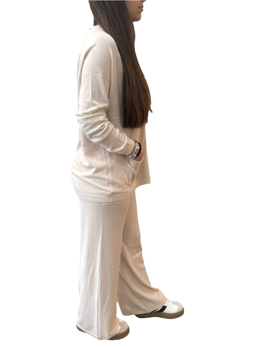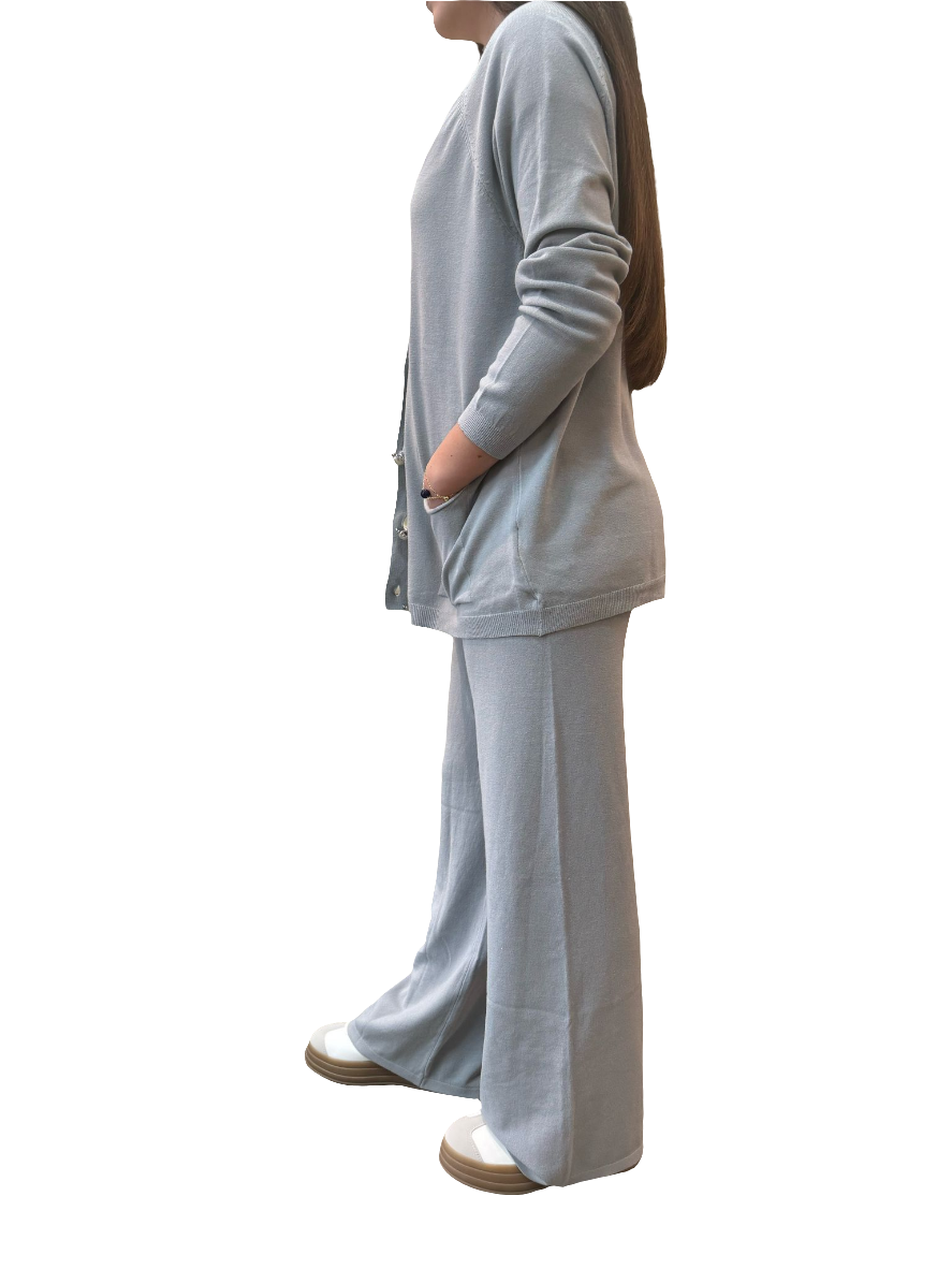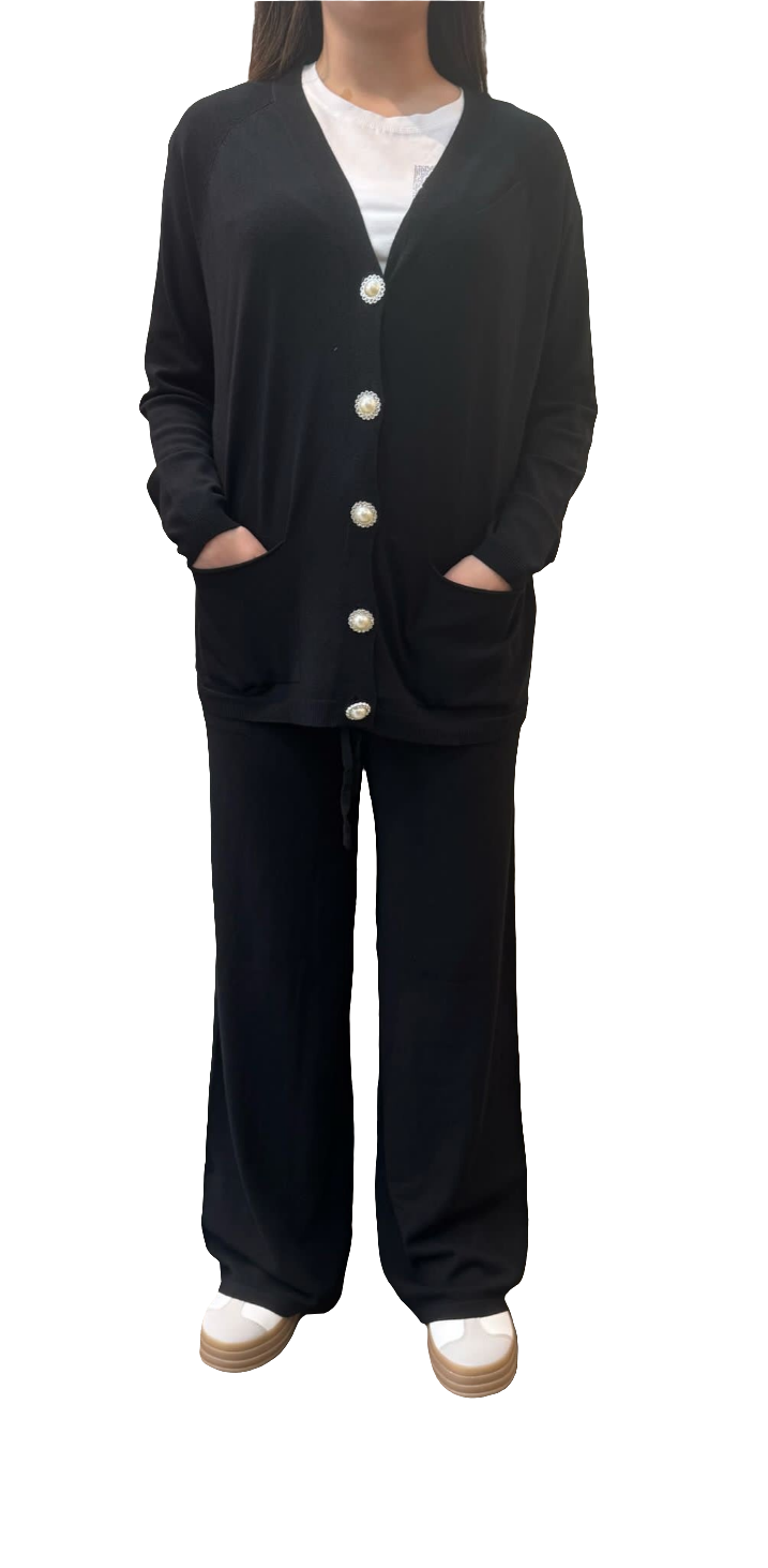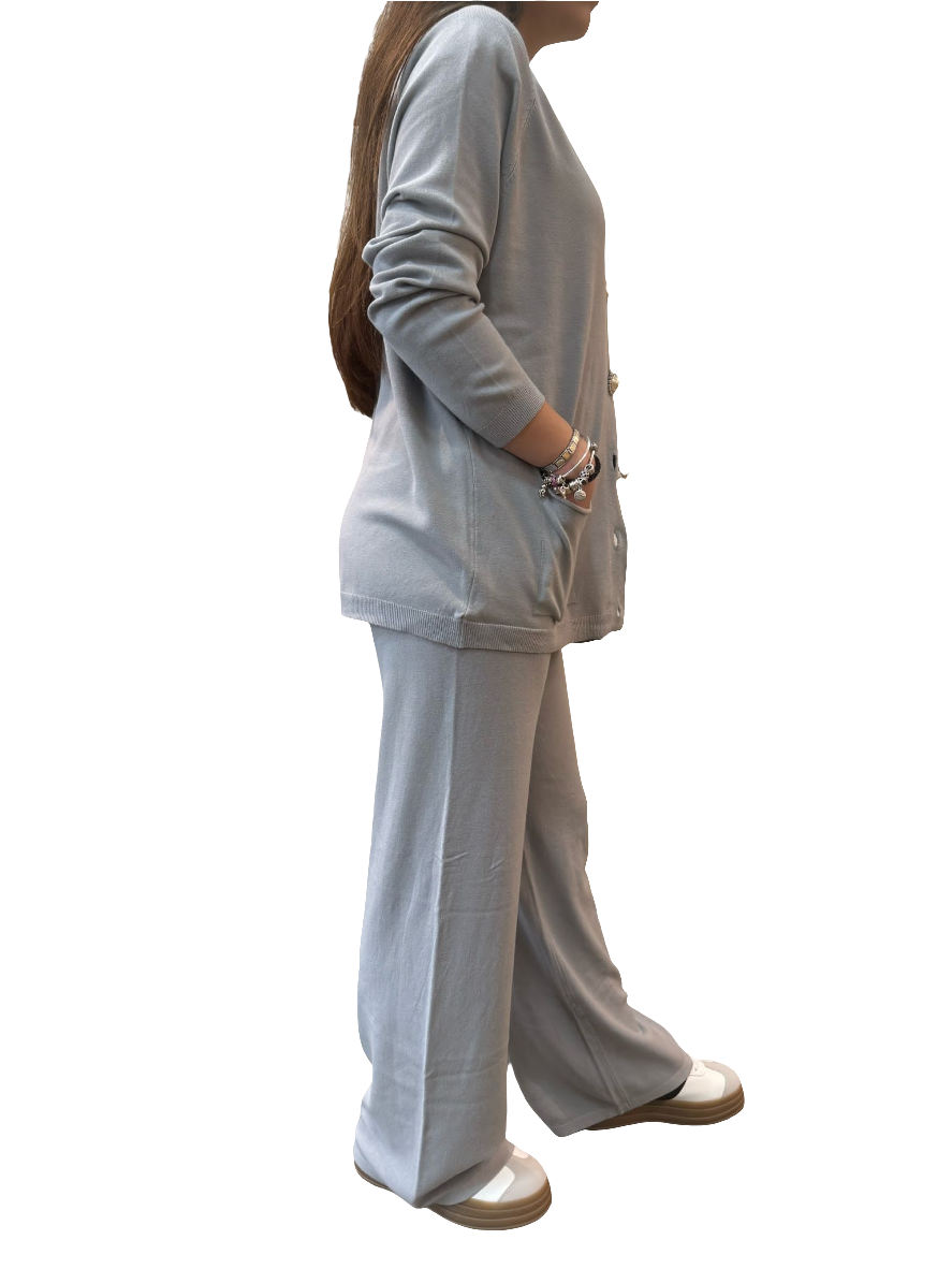 Questo completo in maglia leggero è composto da un cardigan con bottoni e un pantalone morbido, perfetto per le giornate più fresche. Il cardigan ti terrà al caldo senza risultare pesante, mentre il pantalone ti garantirà una vestibilità comoda e confortevole. Ideale per un look casual ma sempre elegante.