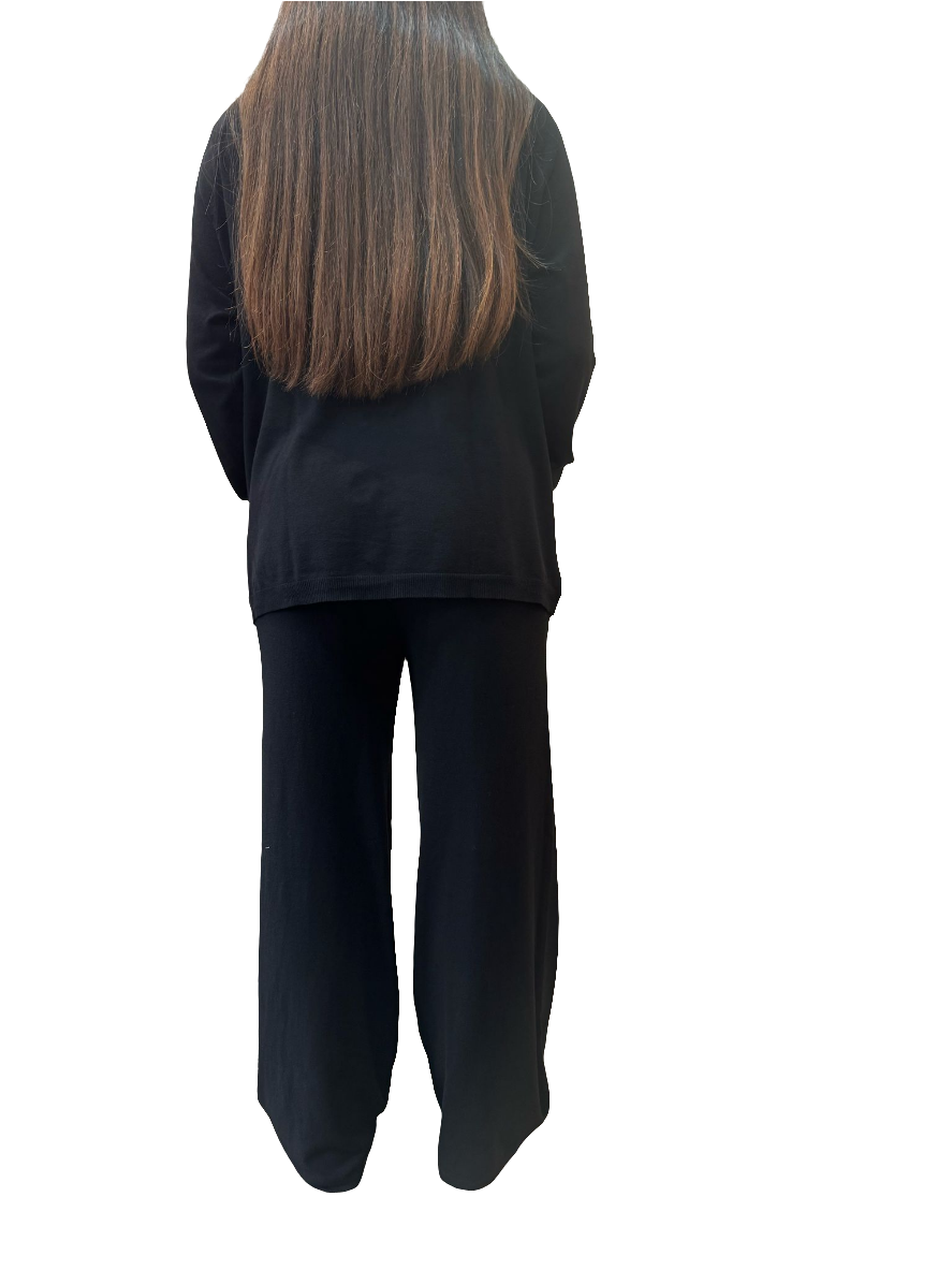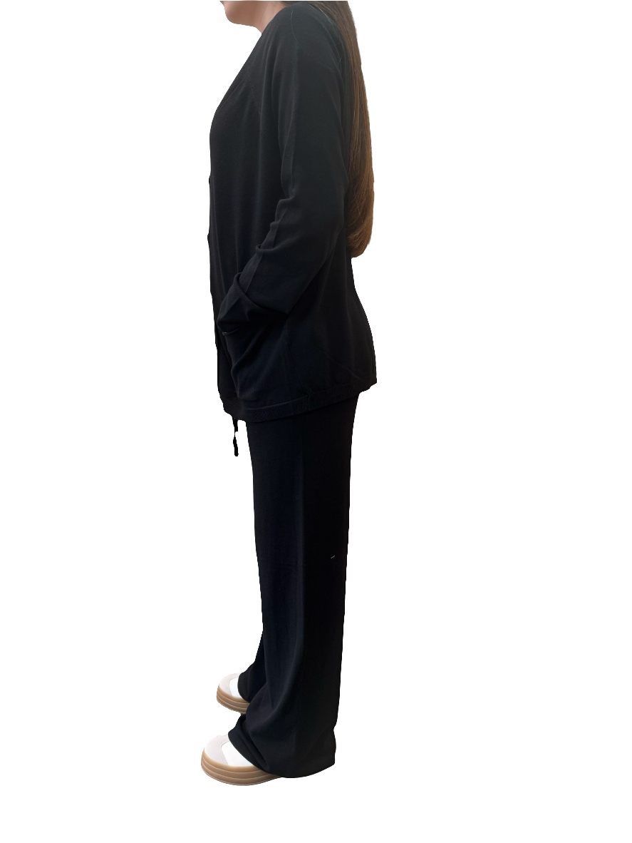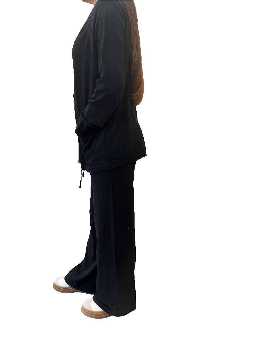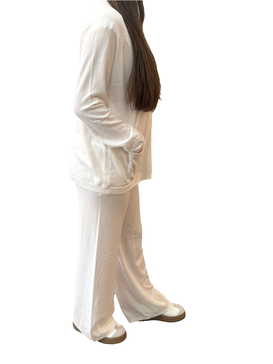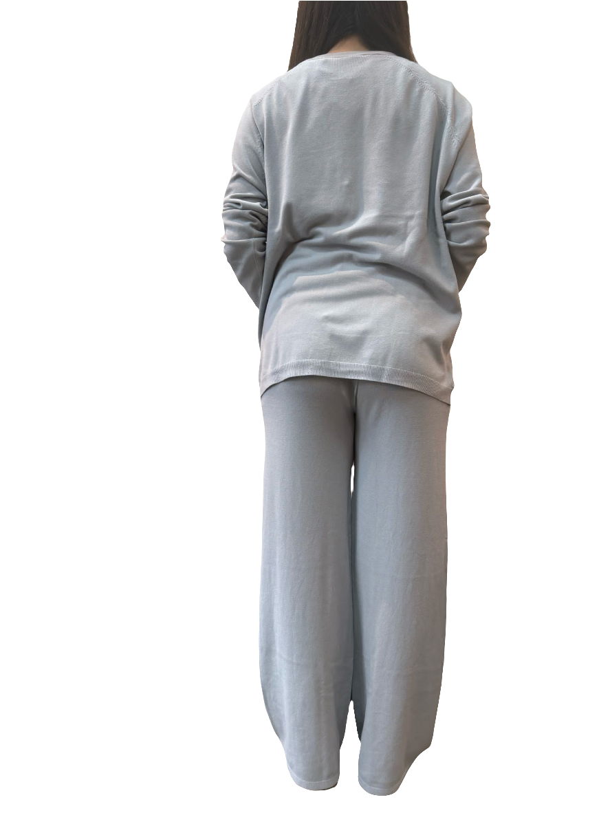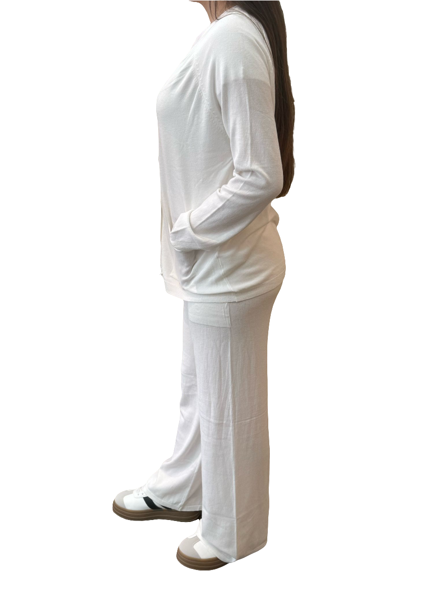 Questo completo in maglia leggero è composto da un cardigan con bottoni e un pantalone morbido, perfetto per le giornate più fresche. Il cardigan ti terrà al caldo senza risultare pesante, mentre il pantalone ti garantirà una vestibilità comoda e confortevole. Ideale per un look casual ma sempre elegante.