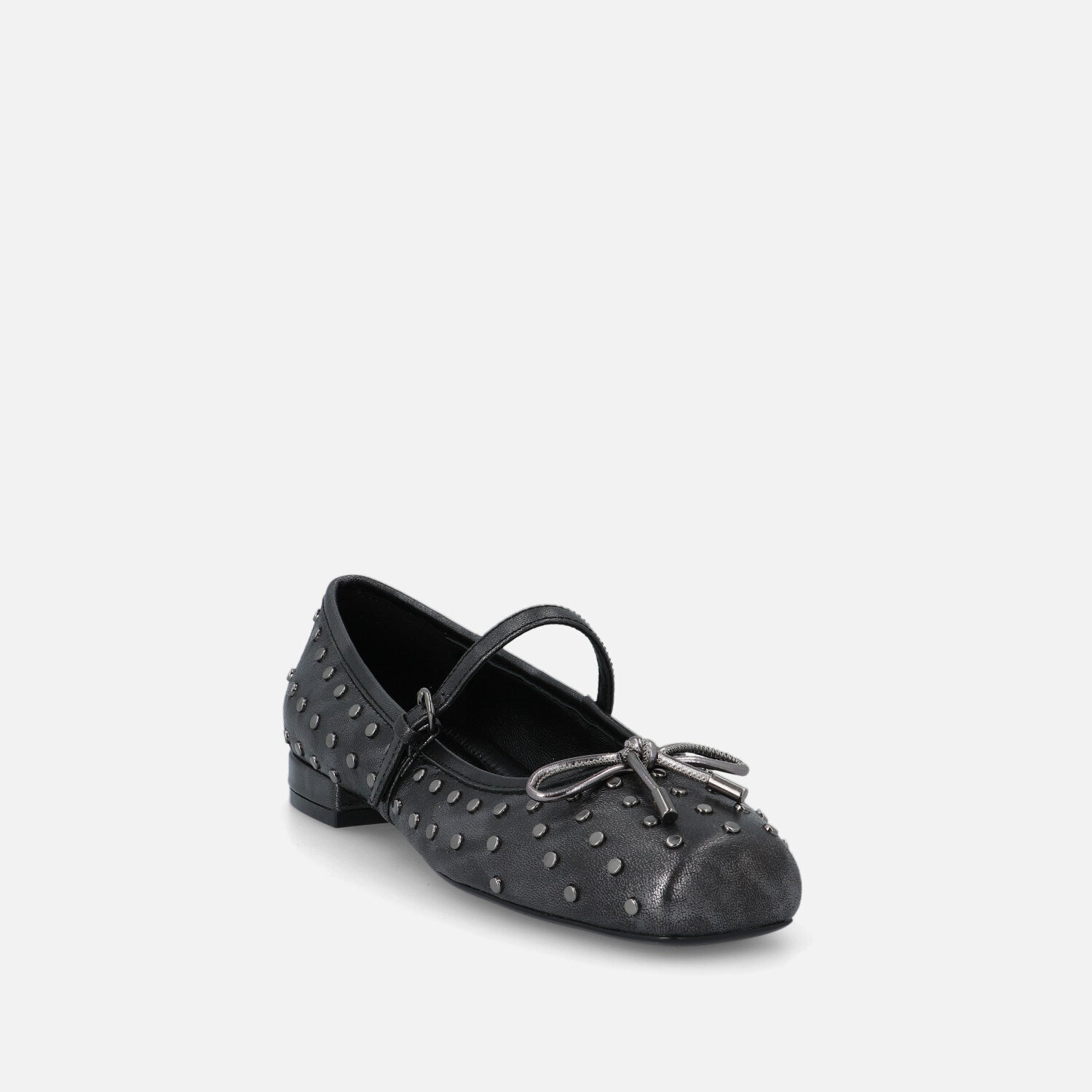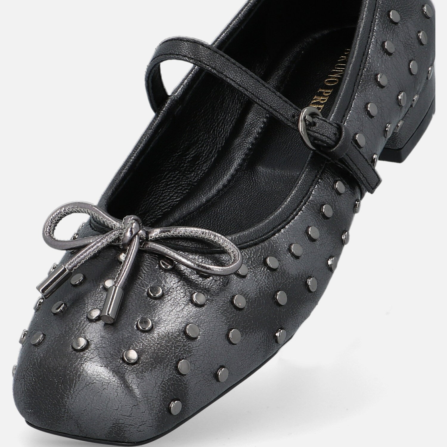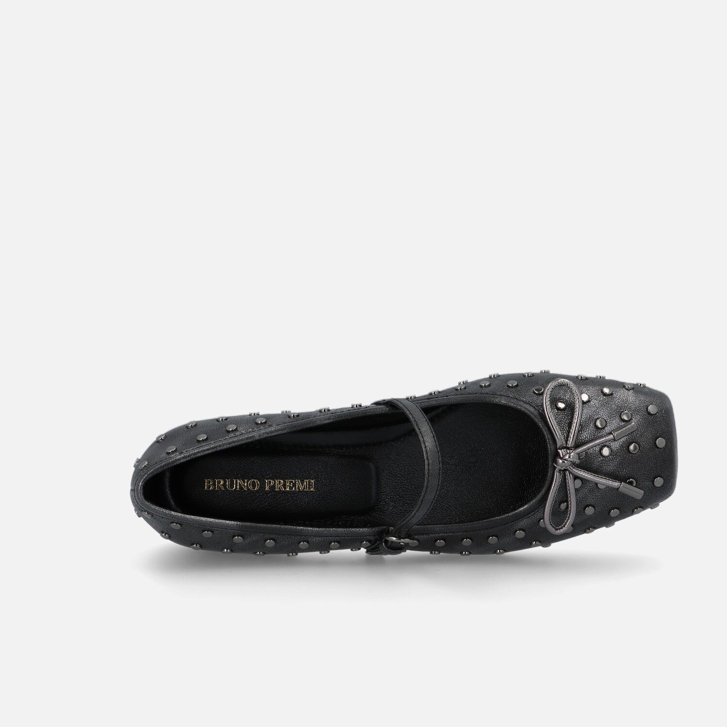 Le Gamine sono le ballerine di Bruno Premi. A punta piatta in pelle unisce spirito romantico e dettagli grintosi. La forma con punta squadrata offre un’estetica moderna e femminile, mentre la tomaia è impreziosita da una fitta applicazione di micro borchie metalliche che creano un dinamismo grafico e luminoso. Il cinturino sottile con fibbia sul collo del piede richiama lo stile Mary Jane, e il fiocchetto decorativo sulla parte frontale aggiunge un tocco delicato. La suola flat garantisce il massimo comfort per un uso quotidiano. Un modello perfetto per chi desidera uno stile casual ma curato, con una nota rock e sofisticata.