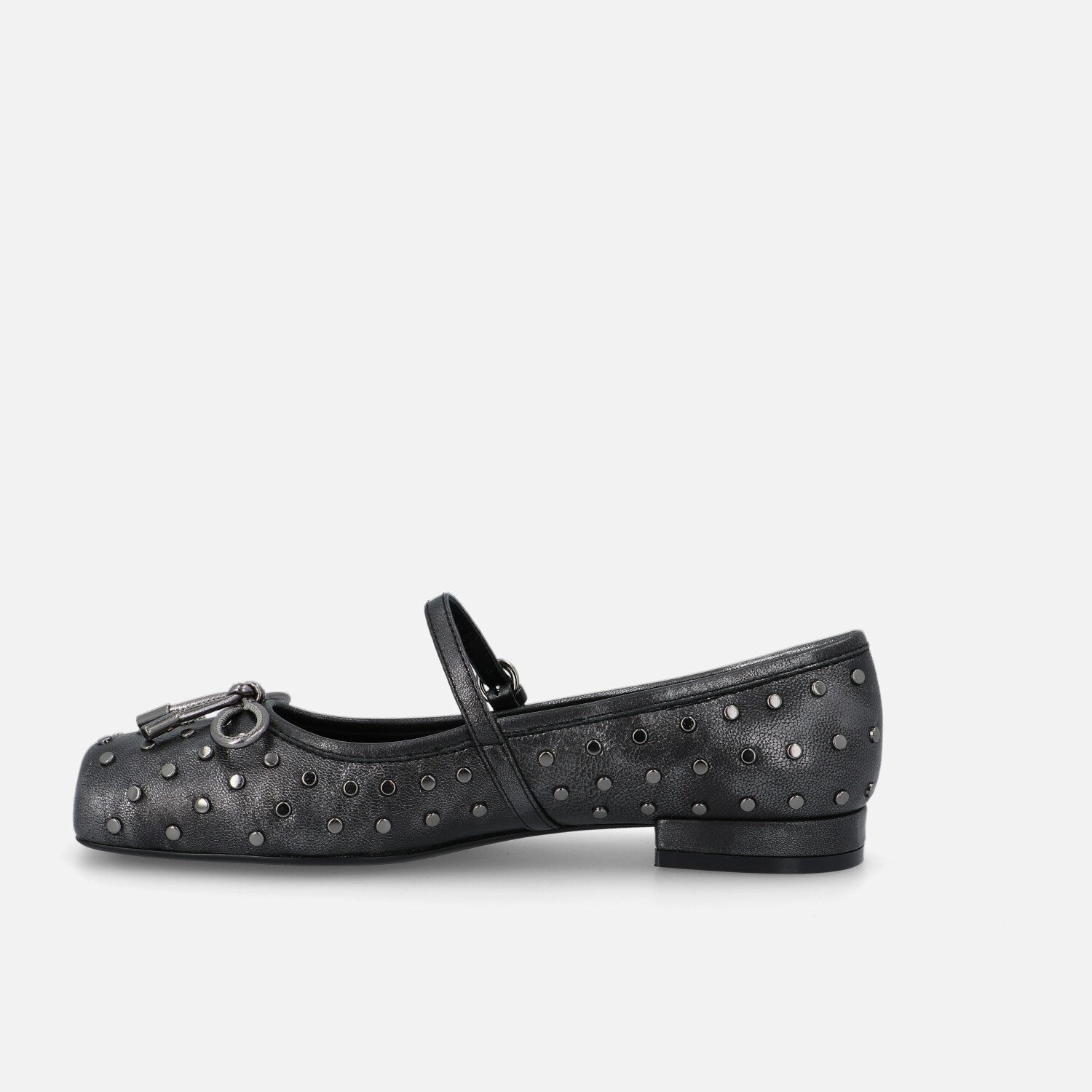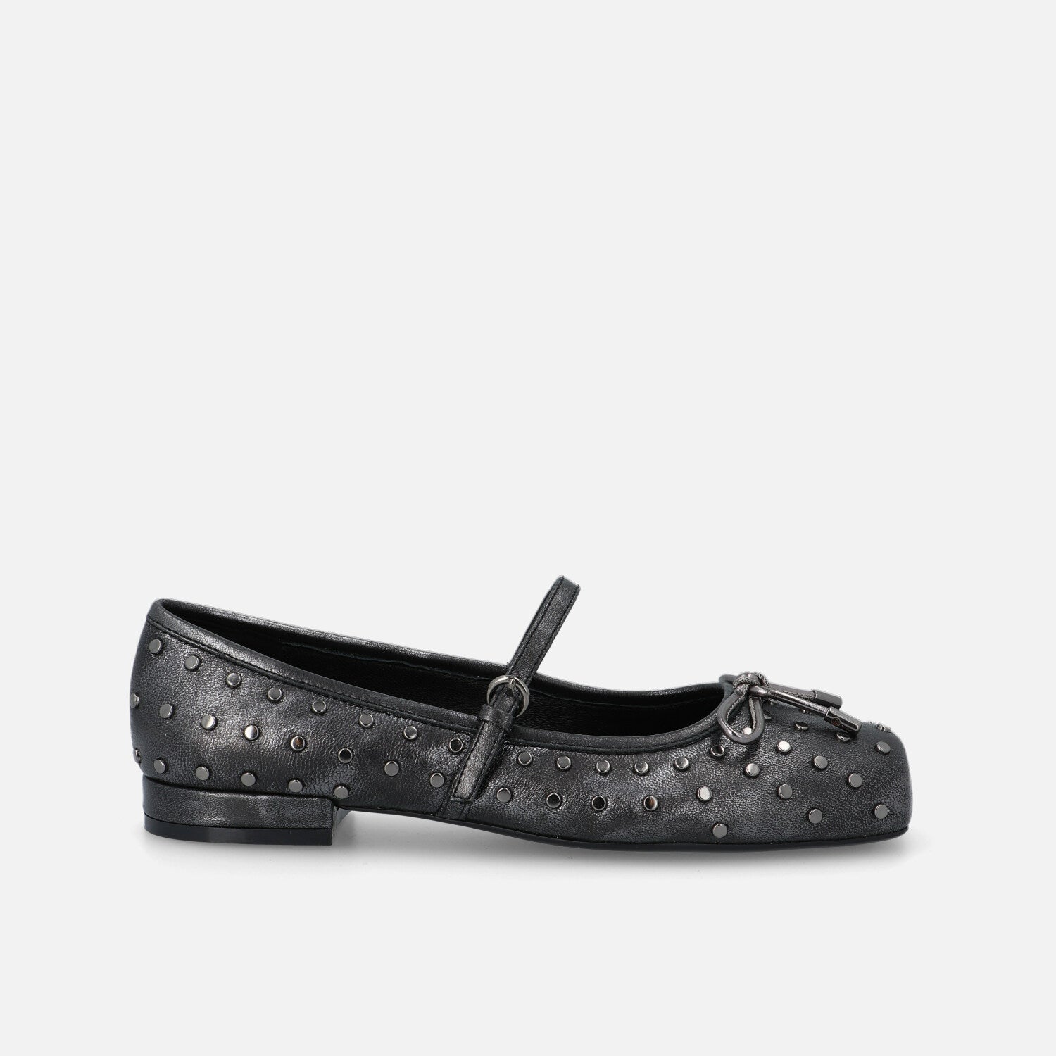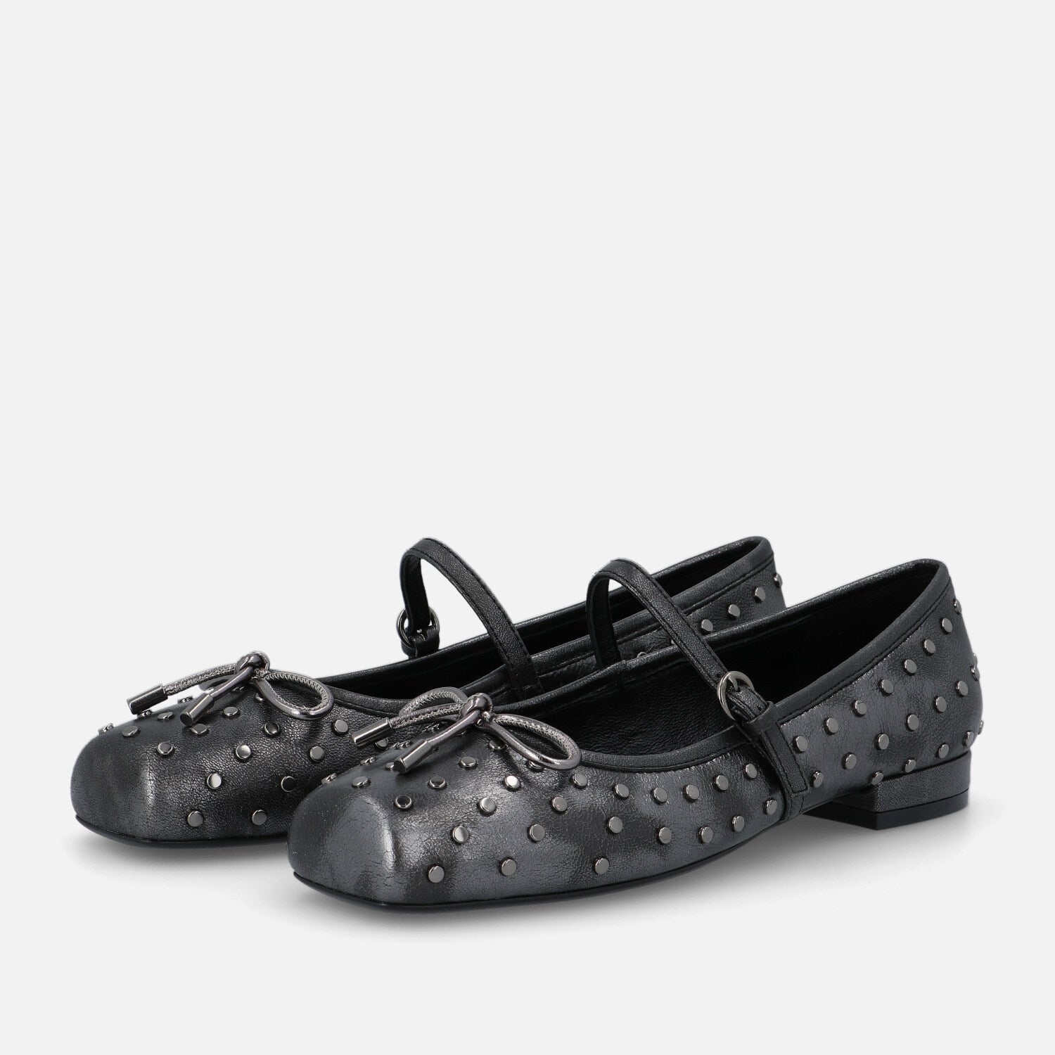 Le Gamine sono le ballerine di Bruno Premi. A punta piatta in pelle unisce spirito romantico e dettagli grintosi. La forma con punta squadrata offre un’estetica moderna e femminile, mentre la tomaia è impreziosita da una fitta applicazione di micro borchie metalliche che creano un dinamismo grafico e luminoso. Il cinturino sottile con fibbia sul collo del piede richiama lo stile Mary Jane, e il fiocchetto decorativo sulla parte frontale aggiunge un tocco delicato. La suola flat garantisce il massimo comfort per un uso quotidiano. Un modello perfetto per chi desidera uno stile casual ma curato, con una nota rock e sofisticata.