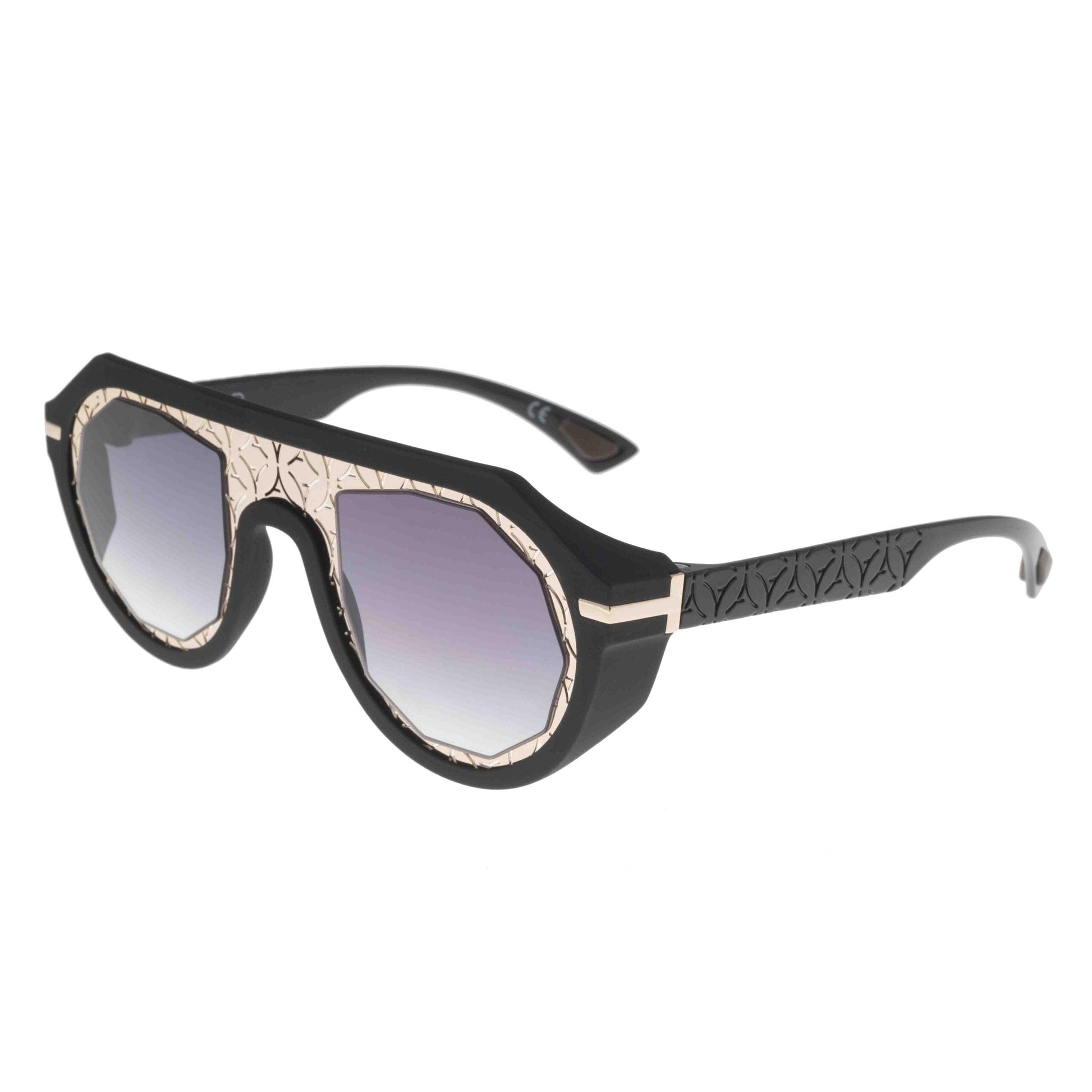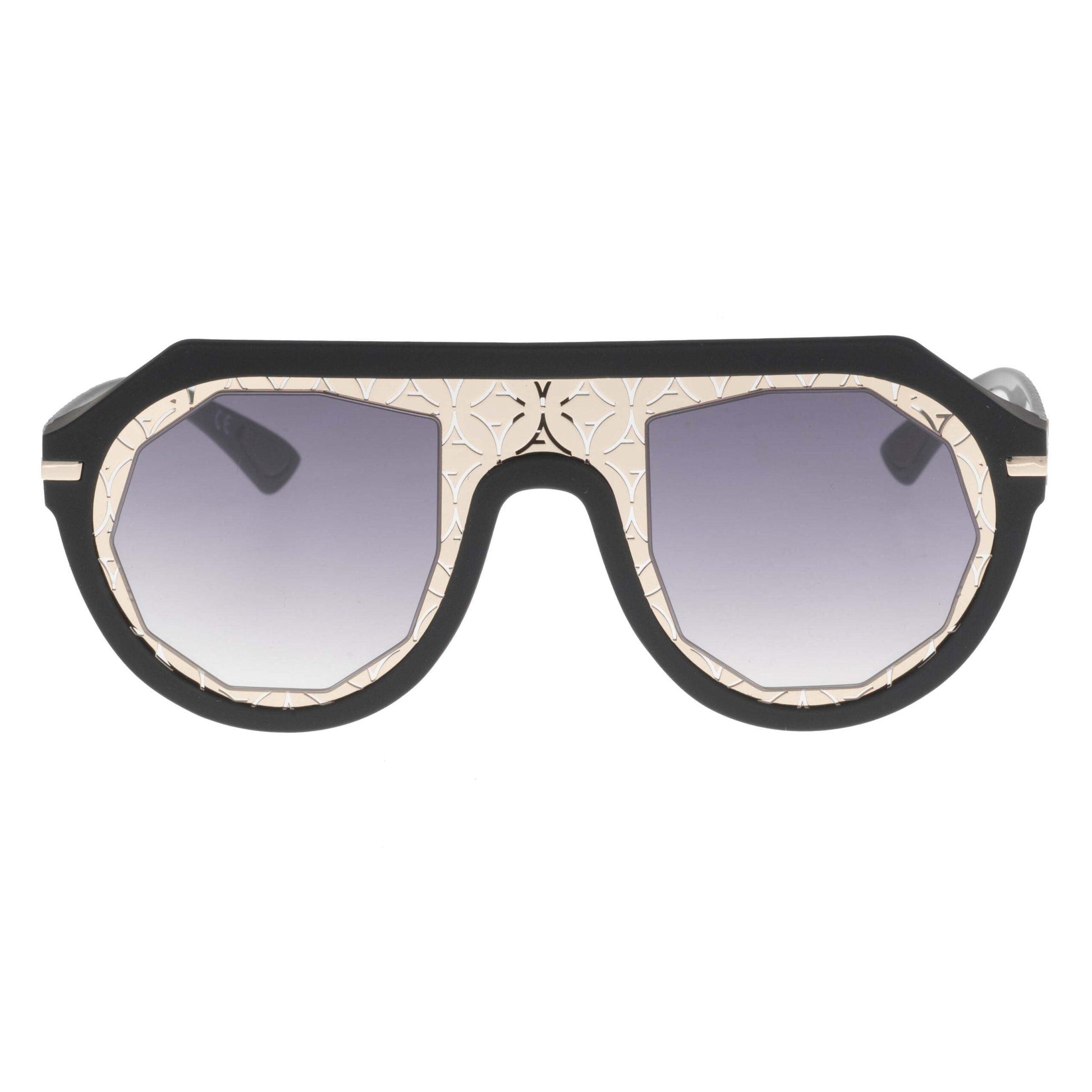 Questo modello oversize presenta frontale e aste nere, con motivo geometrico oro e logo a vista nella maschera, che conferiscono carattere e riconoscibilità immediata. La forma a maschera oversize valorizza il viso e conferisce un look moderno e iconico.