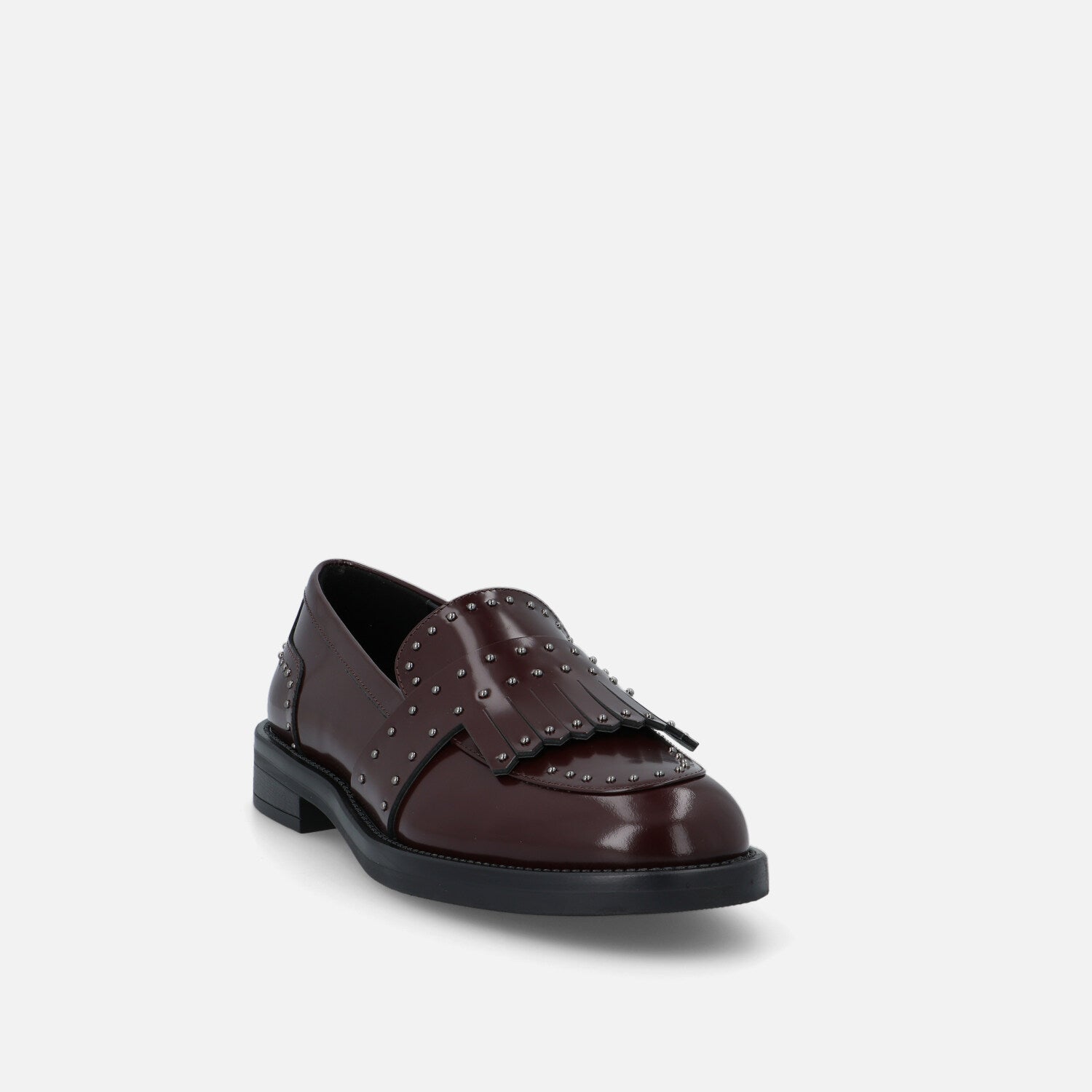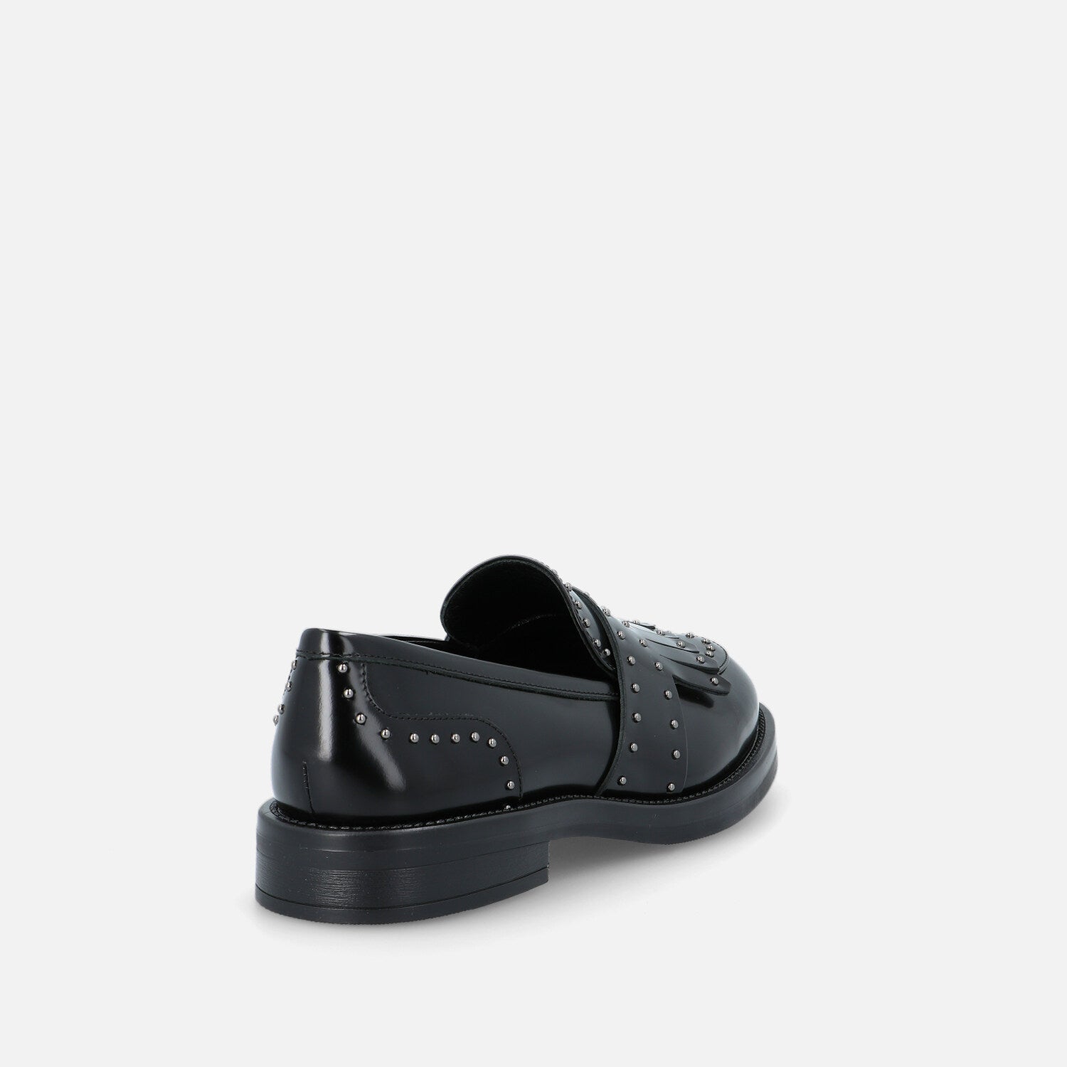 I mocassini Liv Engla in pelle abrasivata coniugano eleganza formale e dettagli rock. La tomaia lucida è arricchita da una frangia frontale decorativa e da una mascherina ampia, entrambe impreziosite da micro borchie metalliche che donano ritmo e carattere al design. Il profilo classico con punta arrotondata si abbina a una suola in gomma con tacco basso, per un comfort duraturo e un look deciso. Un modello che reinterpreta lo stile college in chiave contemporanea, ideale per aggiungere un twist grintoso a outfit da giorno e da ufficio.