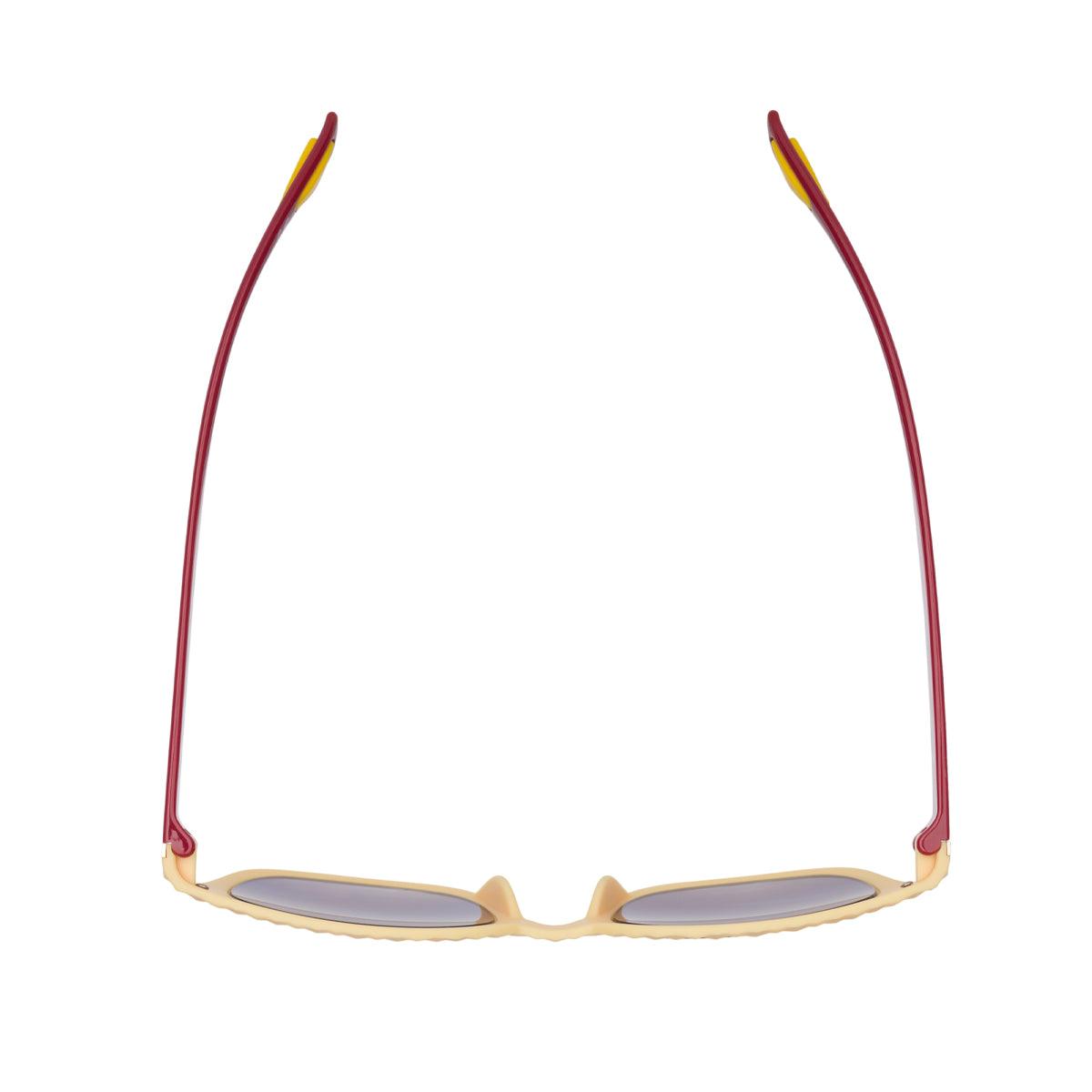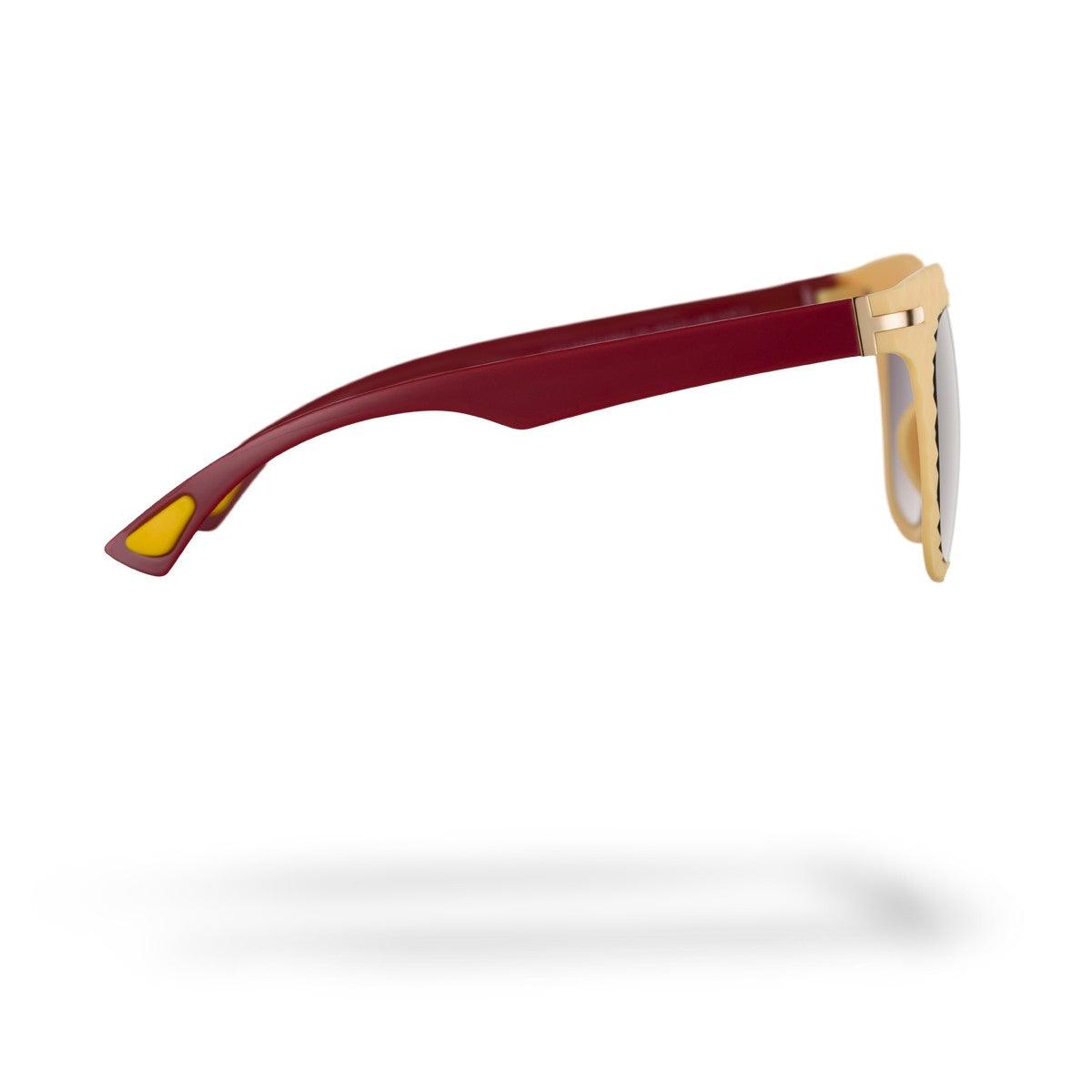 Il frontale giallo soft touch si abbina alle aste rosse lucide, creando un contrasto vivace e moderno. Le lenti da sole grigie lucide offrono protezione dai raggi solari e comfort visivo in ogni condizione di luce.