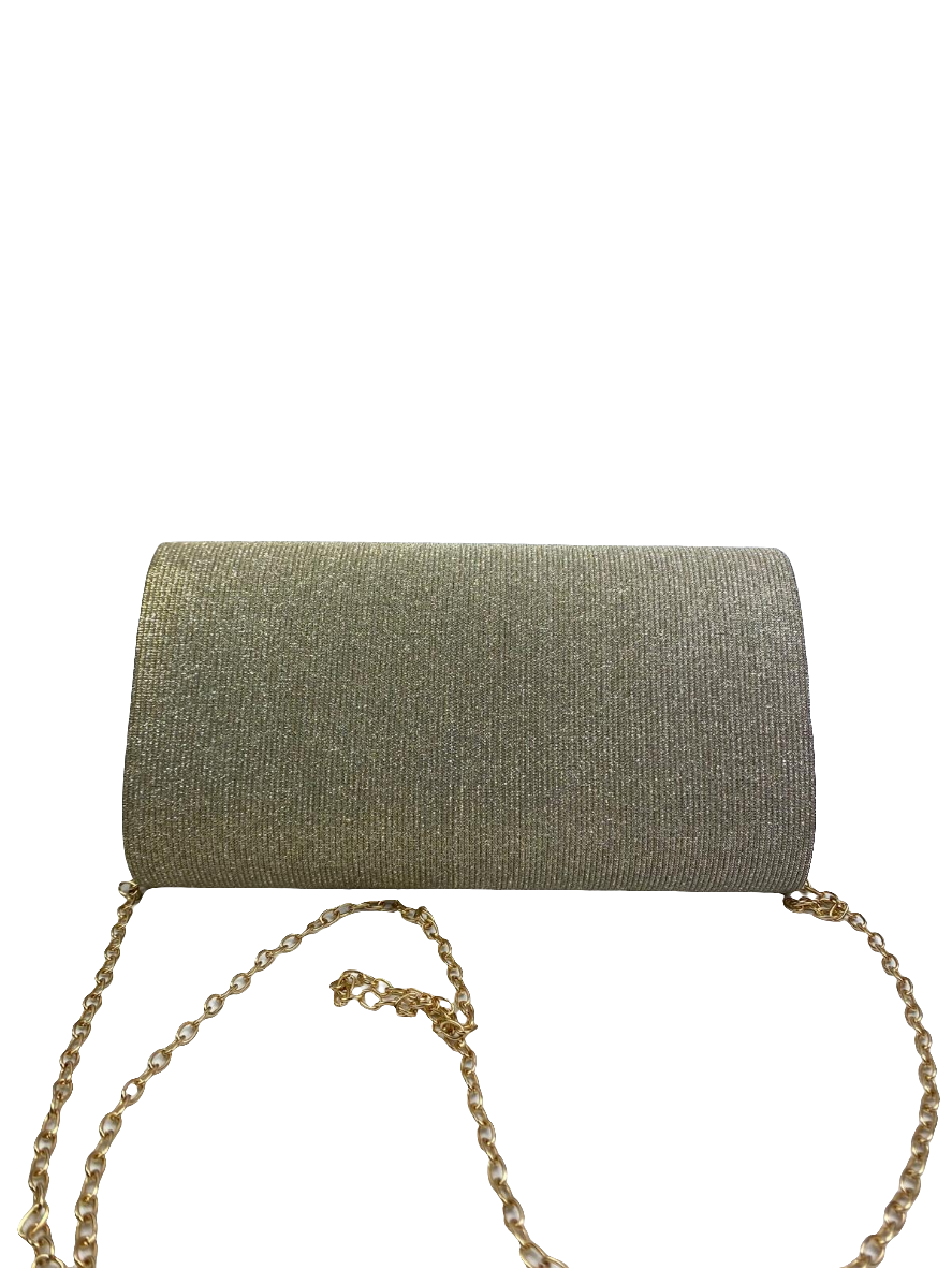 La pochette oro brillantinata con tracolla è un must-have per aggiungere un tocco di lusso e stile al tuo outfit. La tracolla ti permette di portarla comodamente come borsa a mano o a spalla. Grazie alla sua brillantezza, sarà senza dubbio la protagonista dei tuoi accessori.