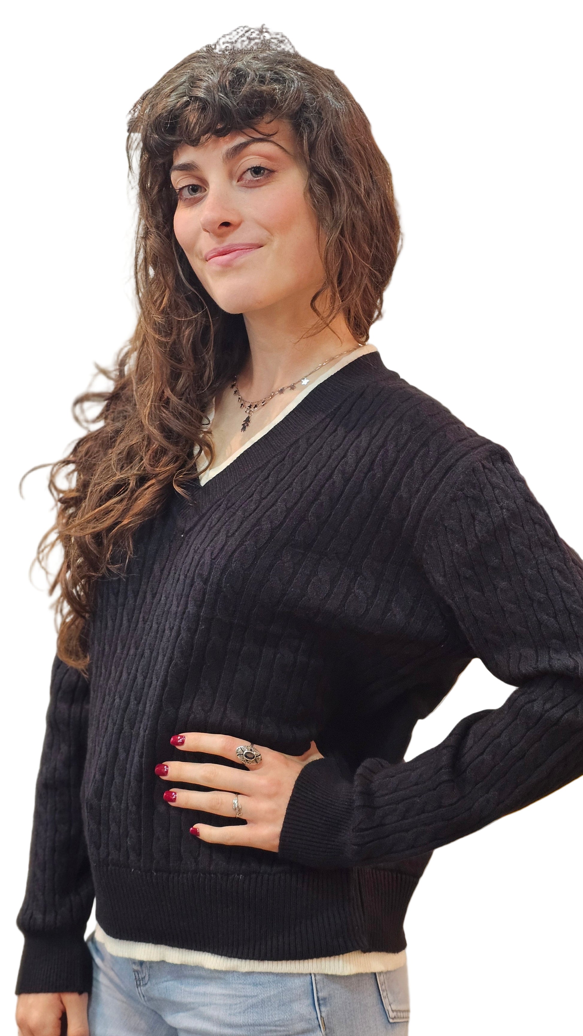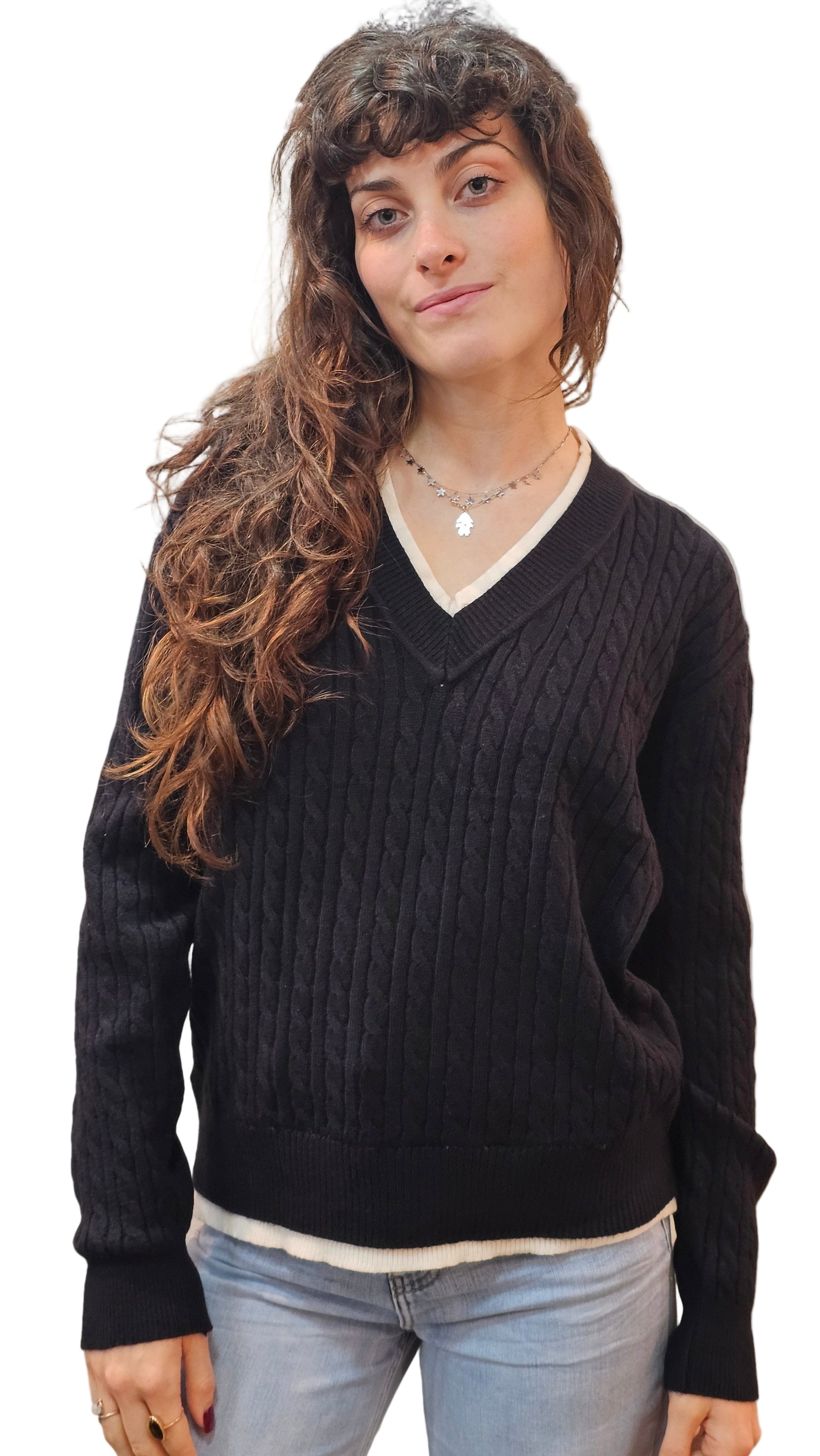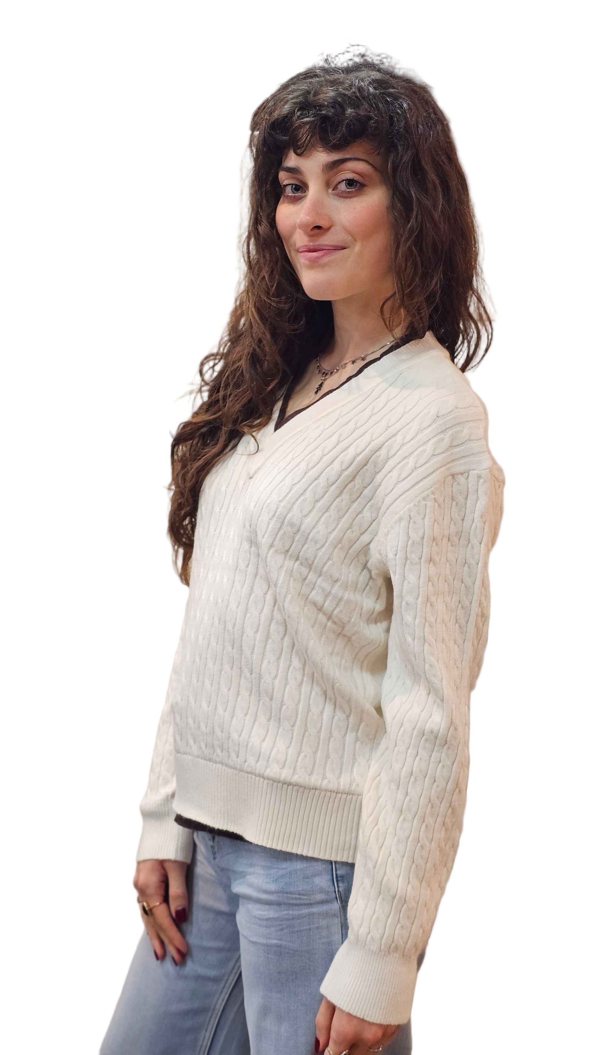 Italiano (Italian): Aggiungi uno stile classico e raffinato al tuo guardaroba con questo pullover a scollo V, realizzato con una delicata treccia. Il design elegante e versatile è perfetto per accompagnarti in qualsiasi occasione, mentre la morbidezza del tessuto ti regala un comfort duraturo.