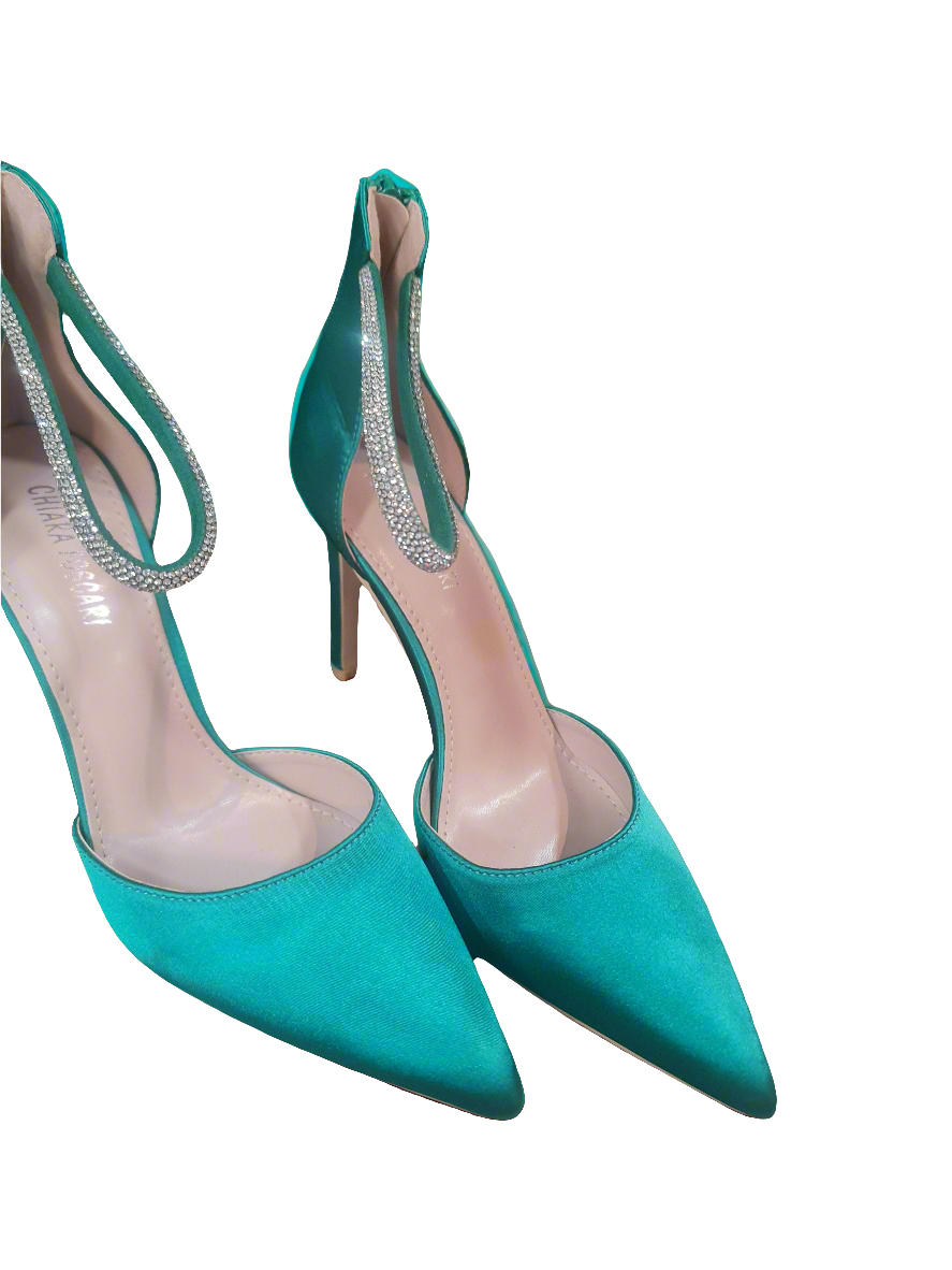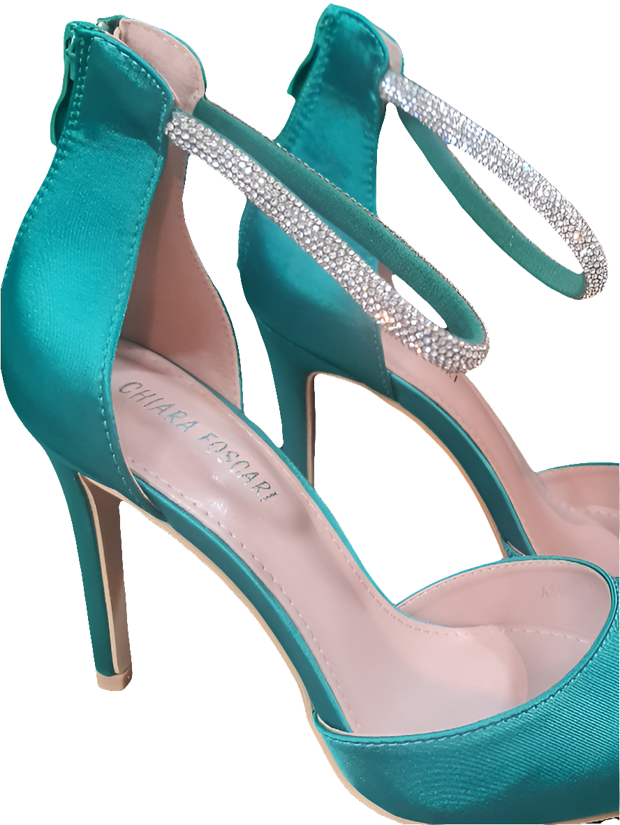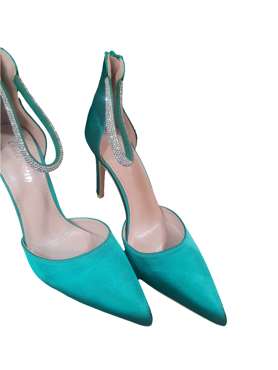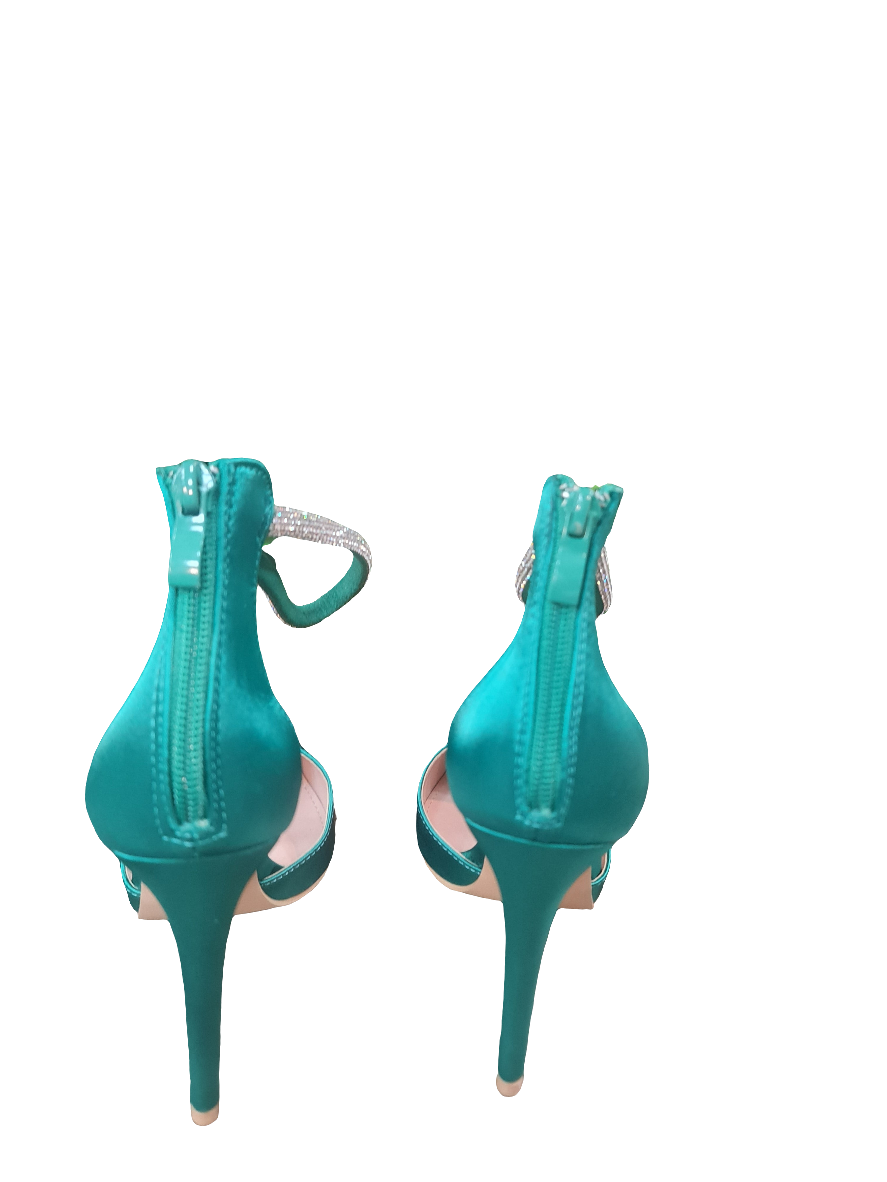 Questo sandalo elegante presenta un design raffinato e moderno. È realizzato in raso di colore verde smeraldo, con una punta affusolata che dona un tocco sofisticato. Il tacco a spillo è sottile e slanciato, ideale per occasioni formali o serate eleganti.