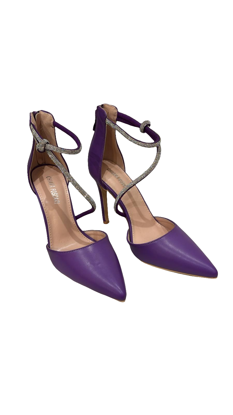 Un dettaglio distintivo è il cinturino alla caviglia decorato con strass scintillanti, che aggiunge luminosità e glamour al modello. La parte posteriore del sandalo è chiusa, offrendo maggiore stabilità. L'interno sembra imbottito per garantire comfort durante l'uso. Questo sandalo è perfetto per completare un look da cerimonia o da evento speciale