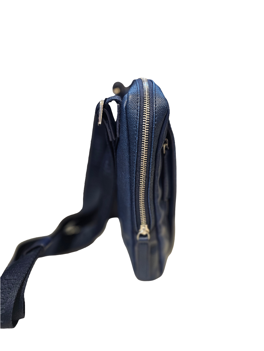 Realizzata in elegante ecopelle blu con la caratteristica lavorazione Geo, la Tracolla 1*Classe unisce stile e funzionalità. Perfetta per portare con sé gli oggetti essenziali, questa tracolla è l'accessorio ideale per chi ama essere sempre alla moda senza rinunciare alla praticità.